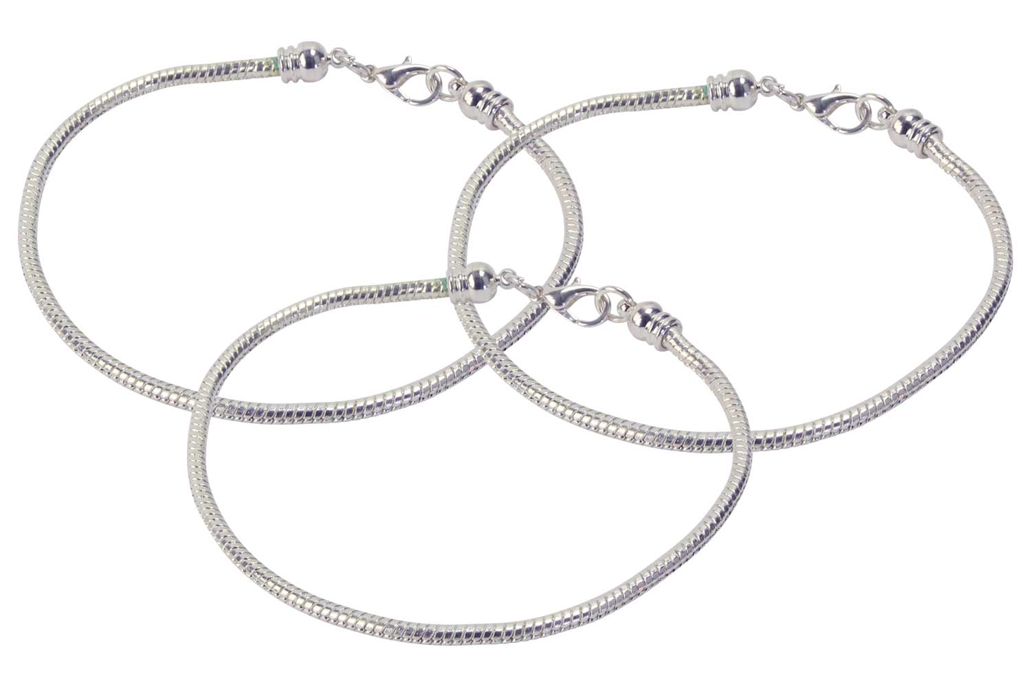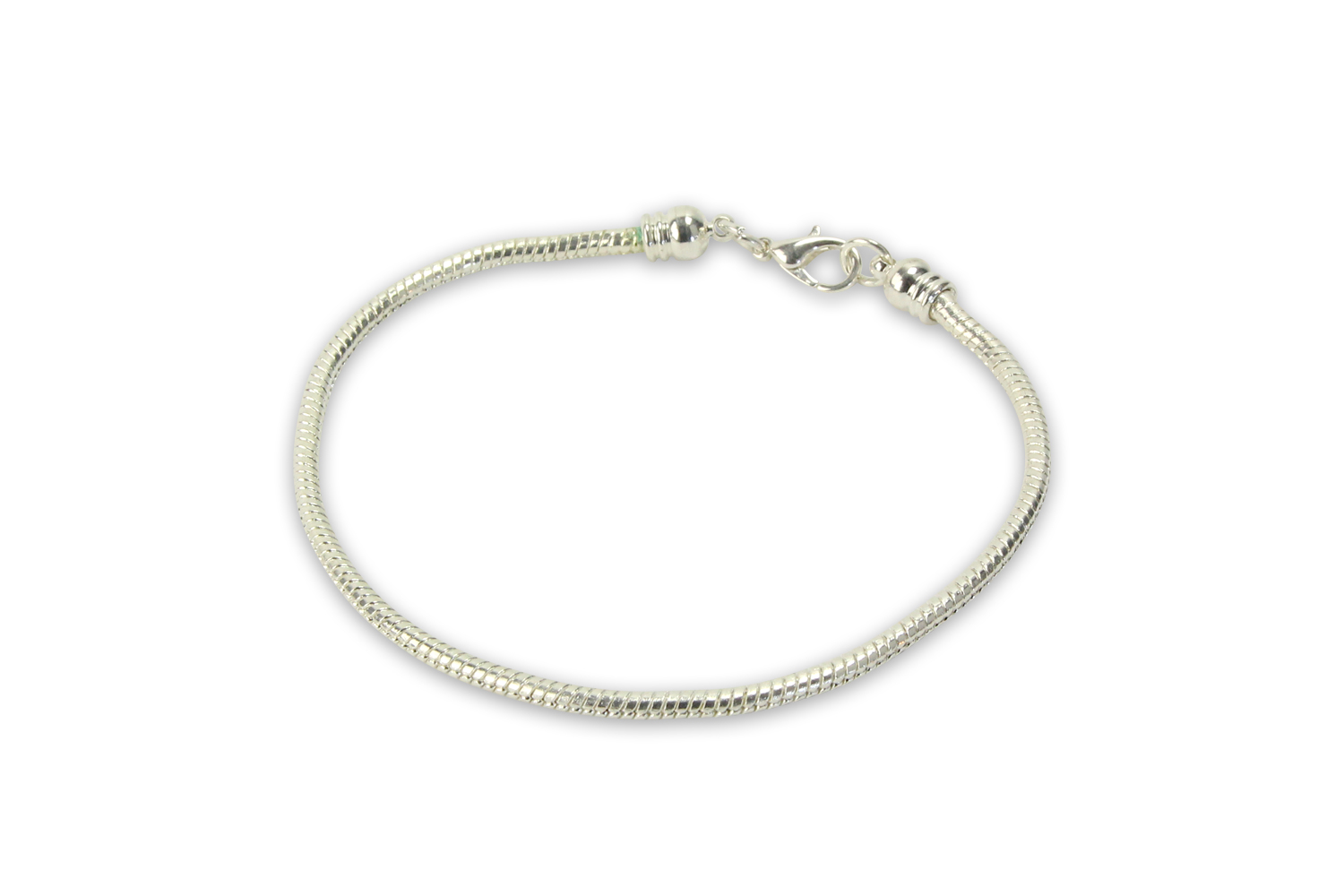 Bracelet en métal pour perles à large trou couleur argenté. Fermoir mousqueton dévissable (côté aléatoire : fermoir ou attache) pour pouvoir enfiler les perles facilement. Sans nickel.