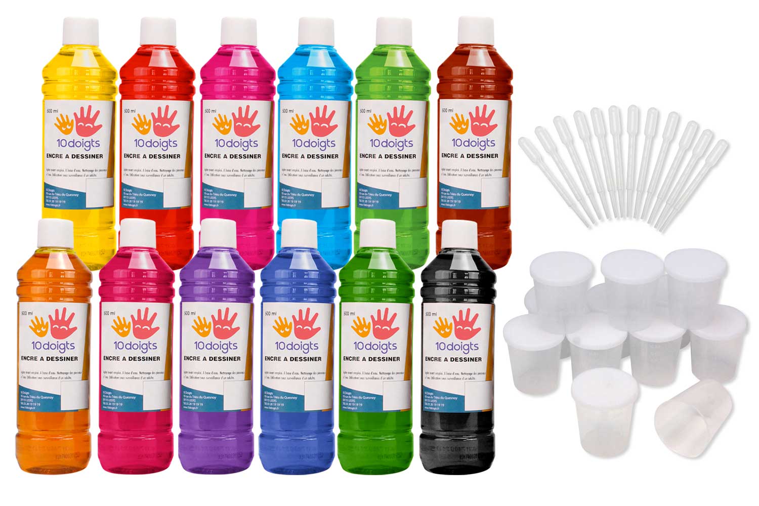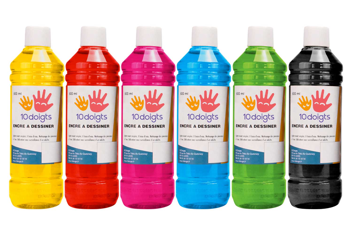 Bouteilles d'encres à dessiner de 500ml idéales pour les collectivités et écoles. Couleurs de qualité supérieure, transparentes et lumineuses, miscibles entres elles pour une infinité de tons. Les couleurs peuvent être superposées une fois sèches. La vivacité, la fraîcheur et la concentration des couleurs de nos encres sont magnifiques. Elles peuvent s'appliquer pures, au pinceau ou à la plume/ Ces encres à base d'eau peuvent être diluées ou aquarellées pour des effets dégradés.