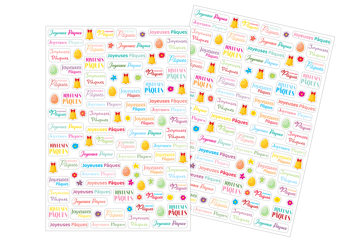 Planches de gommettes avec des décorations de Pâques et messages « Joyeuses Pâques » aux couleurs assorties sur fond blanc. Pratique, collez ces gommettes sur vos créations de Pâques ou pour embellir une carte.