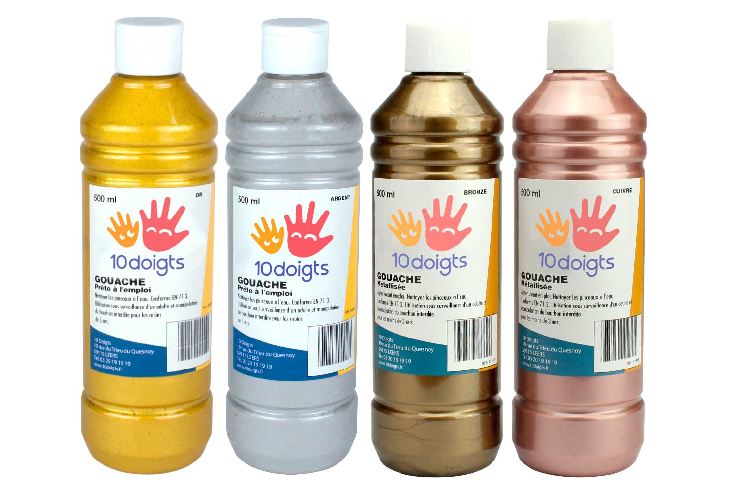 Très belles gouaches disponibles dans 4 couleurs métallisées (or, argent, bronze, cuivre). Bouteille de 500 ml économique, pour peindre sur bois, carton, papier, plâtre... Réalisez de beaux effets nacrés et métallisés pour embellir vos créations de fêtes.