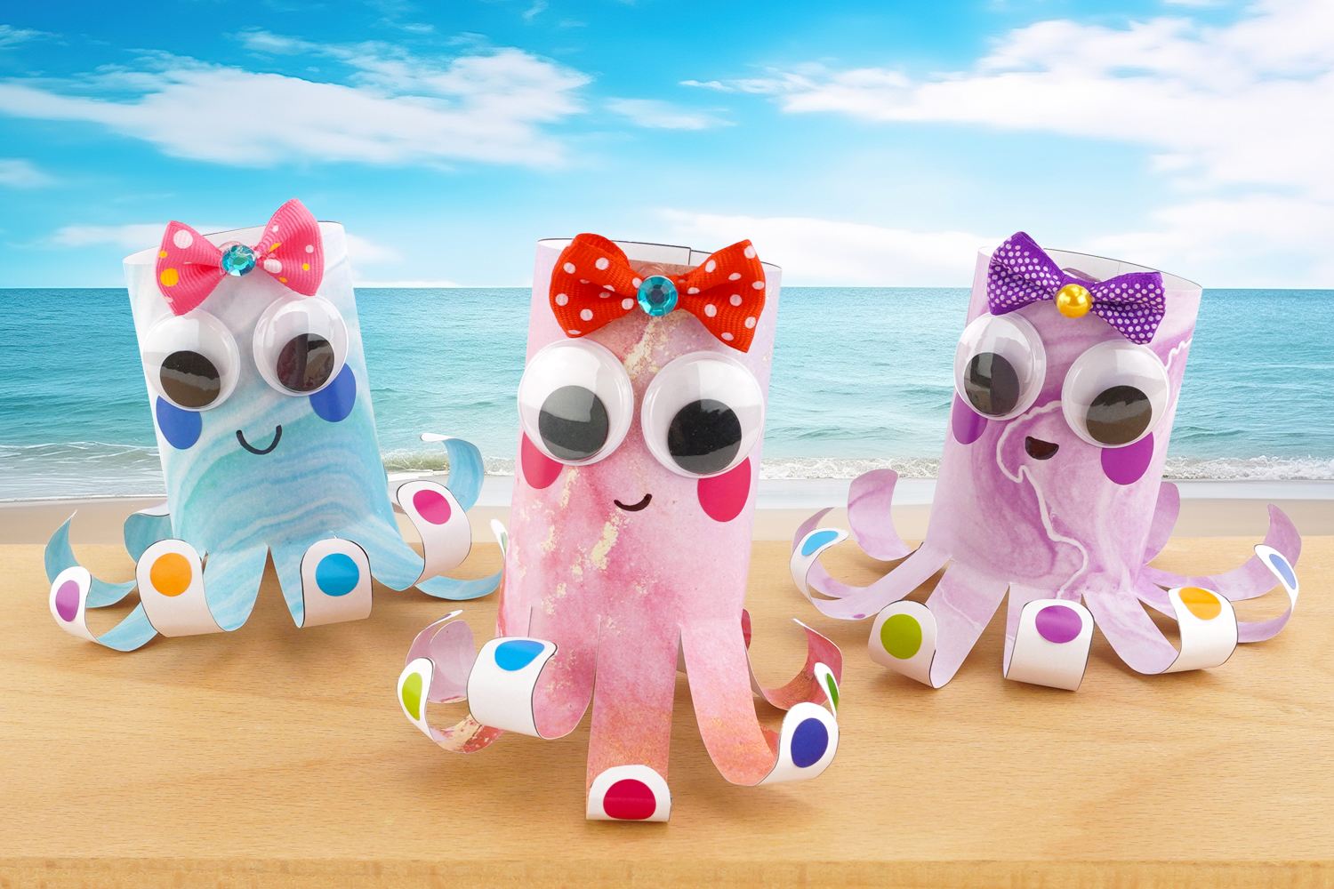 Découvrez une activité colorée et facile pour réaliser une adorable pieuvre en papier. À partir d’un modèle à télécharger, les enfants découpent, enroulent et décorent leur création avec des yeux mobiles, des gommettes rondes et des petits nœuds en tissu. Avec ses tentacules rigolotes et ses grands yeux malicieux, cette pieuvre pleine de fantaisie permettra aux petits artistes de développer leur dextérité tout en laissant libre cours à leur imagination !