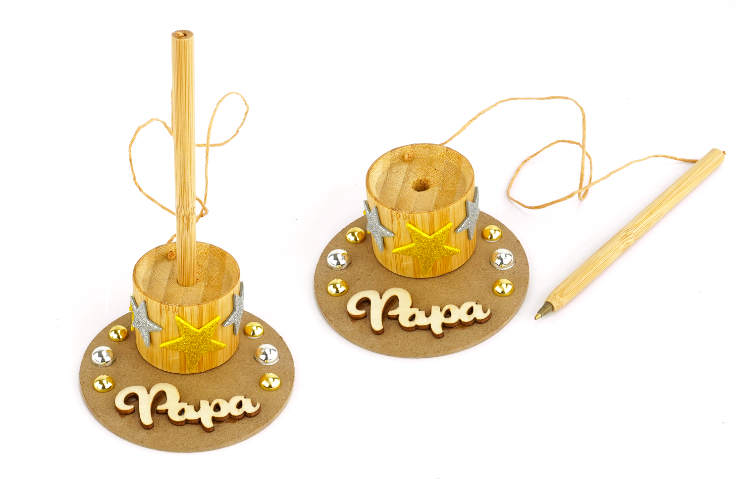 Avec quelques éléments à personnaliser : un socle rond, le mot "Papa" en bois, des cabochons décoratifs et des étoiles autocollantes. Les enfants vont confectionner un objet déco aussi joli qu’utile. Il suffit d’y fixer un porte-stylo avec ficelle… et voilà !