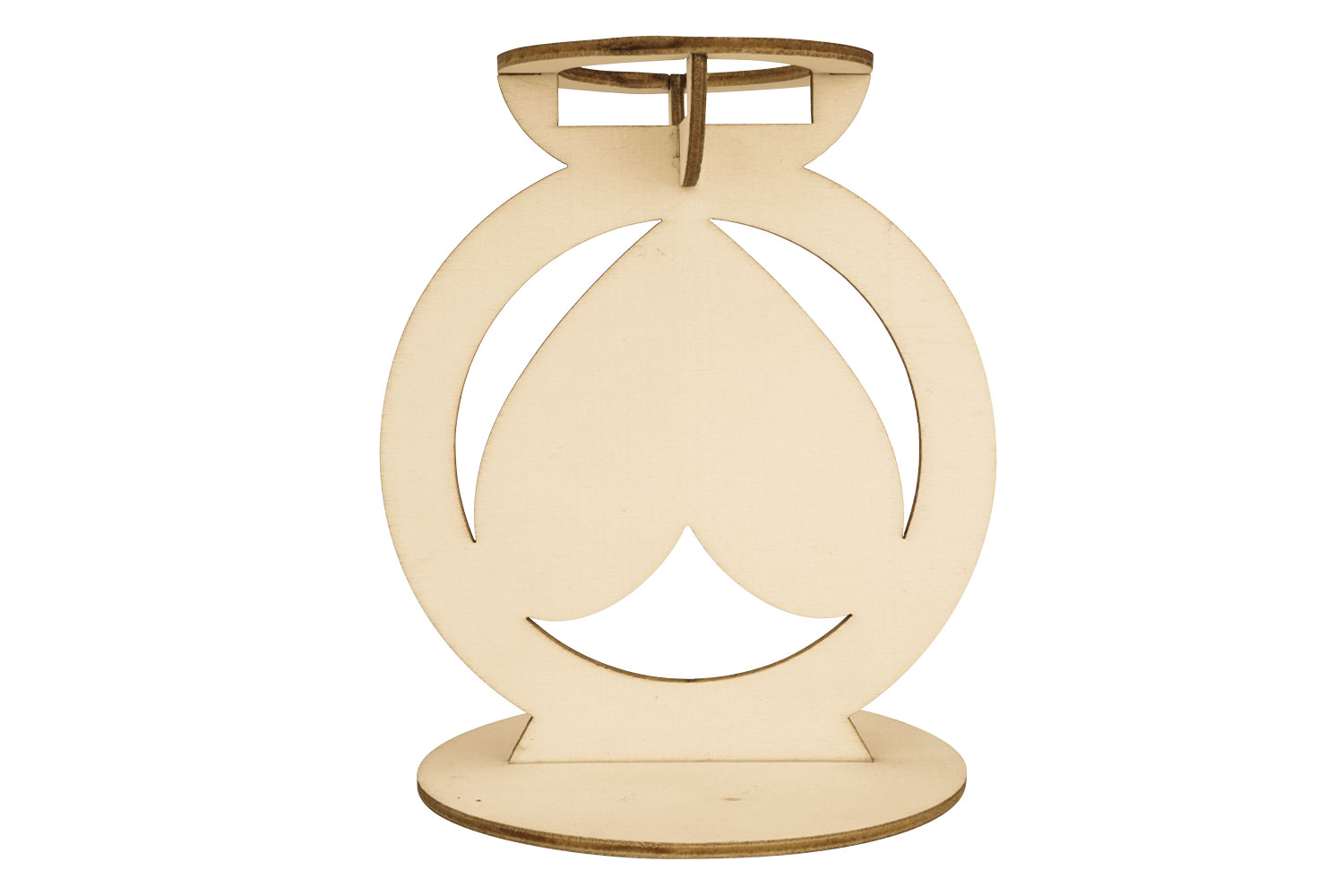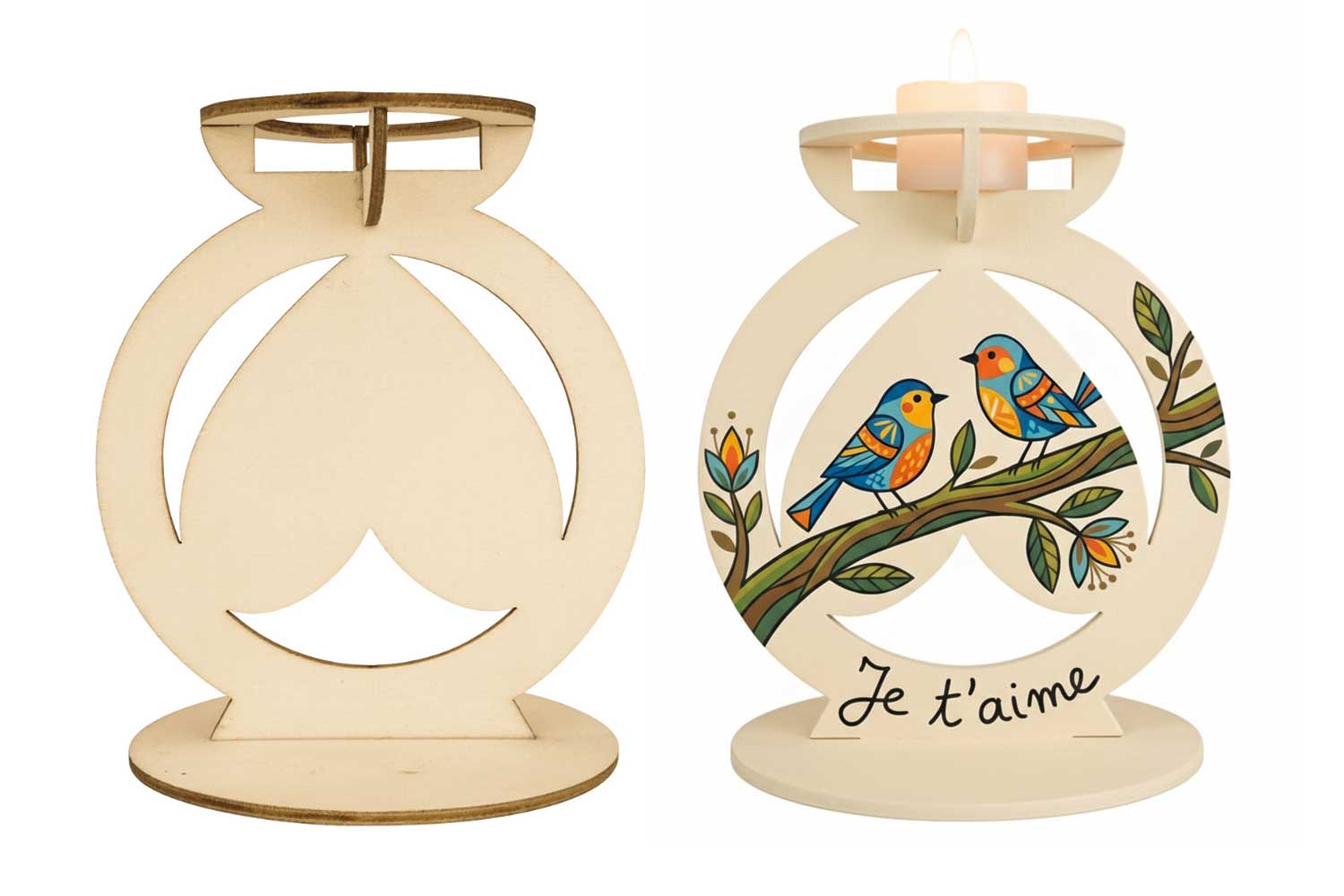 Bougeoirs en bois à monter avec forme "cœur inversé" au centre à décorer. Idéal pour placer une photo, ou à décorer avec des stickers, de la peinture ou autre…