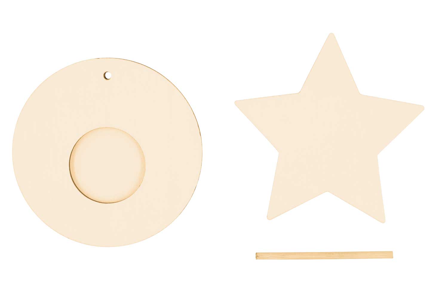 Photophore en bois en forme d'étoile, destiné à des activités créatives. Il se compose d'une base circulaire avec un emplacement au centre pour une bougie (bougie LED) et d'une étoile verticale fixée sur un support. L'étoile en bois peut être décorée ou laissée naturelle, selon le projet créatif. Idéal pour des décorations de Noël ou d'autres occasions festives, permettant aux enfants ou aux adultes de personnaliser leur photophore avec de la peinture, des paillettes, ou d'autres matériaux créatifs.