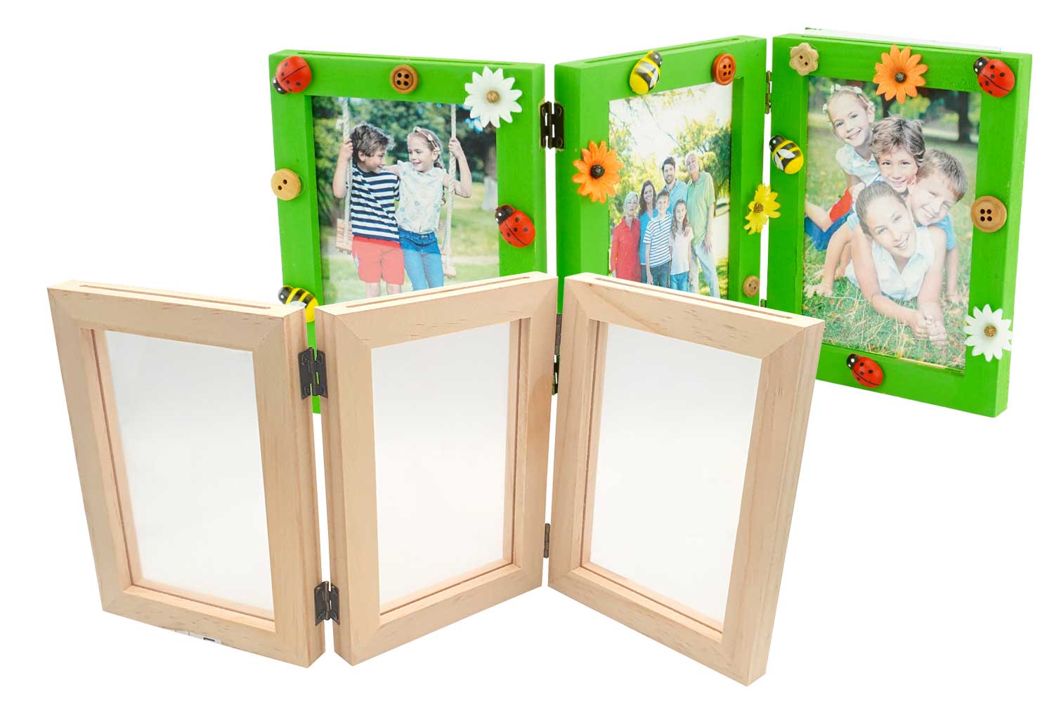 Cadre triptyque double face en bois : Une galerie photo modulable. Racontez une véritable histoire en images avec ce cadre triptyque en bois articulé. Ce support original se compose de trois volets reliés par des charnières : ce qui permet de le déplier comme un accordéon sur vos meubles.