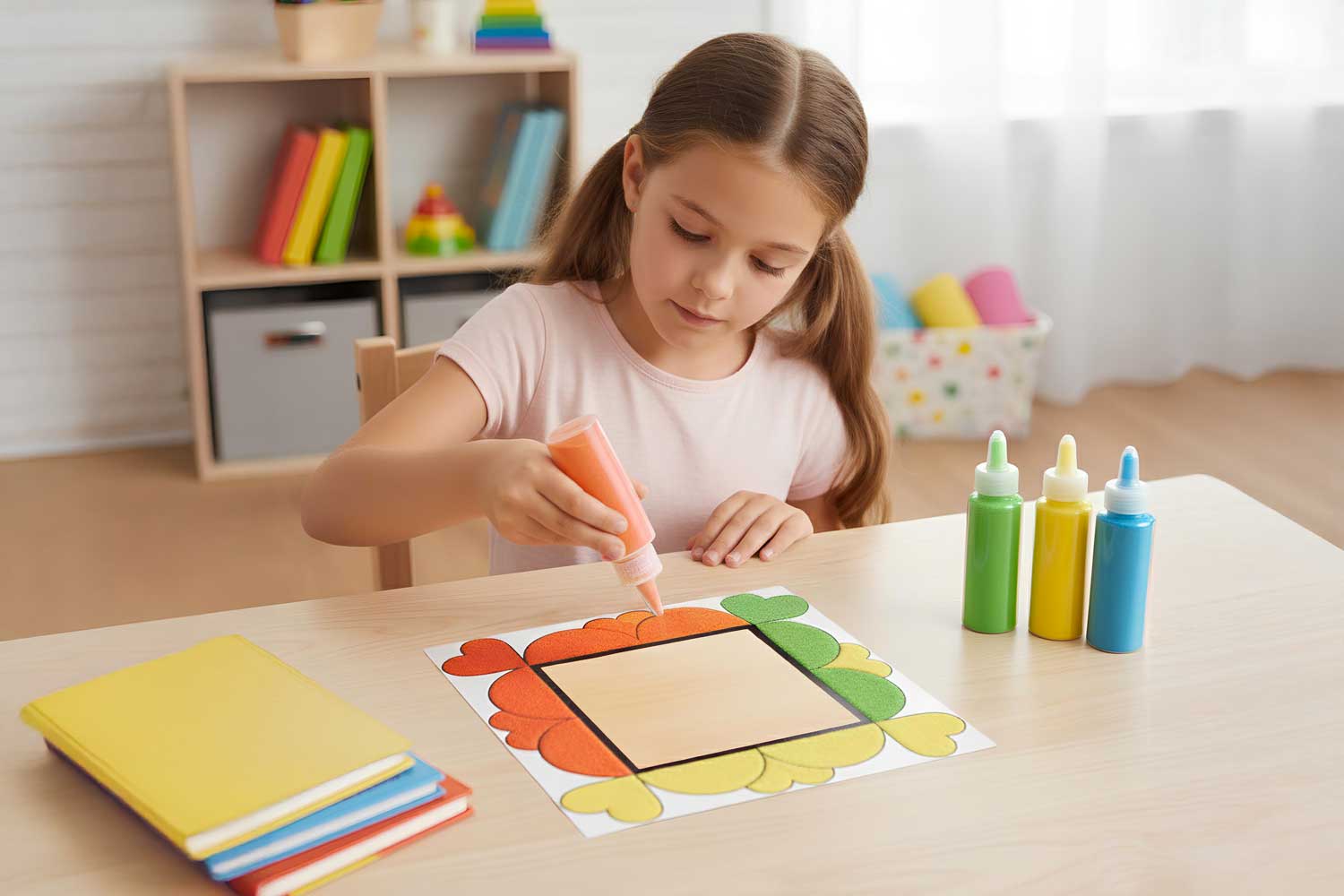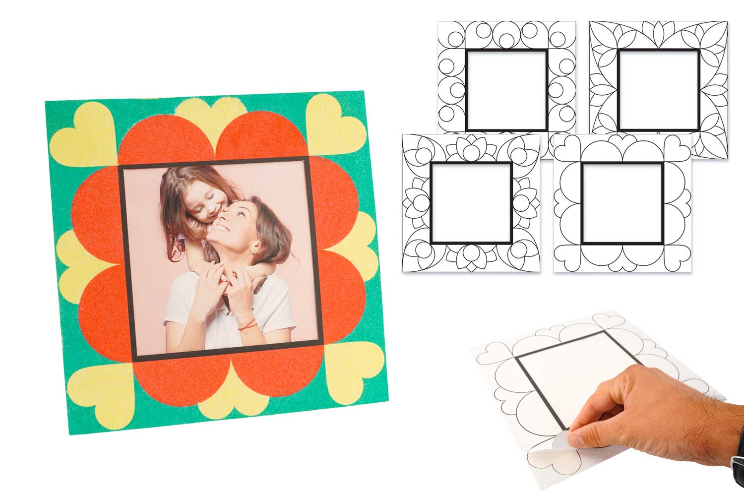 Chaque cadre est prédécoupé avec des motifs adhésifs : il suffit de retirer les formes au fur et à mesure pour révéler une surface autocollante prête à accueillir du sable coloré, des paillettes, du papier de soie ou d’autres décorations.
