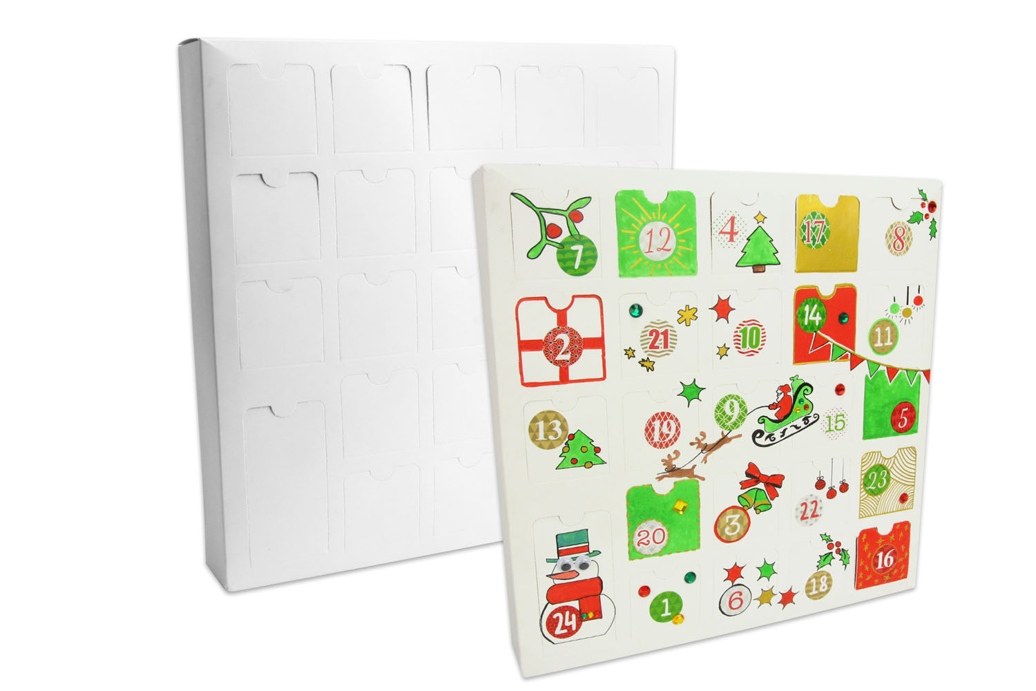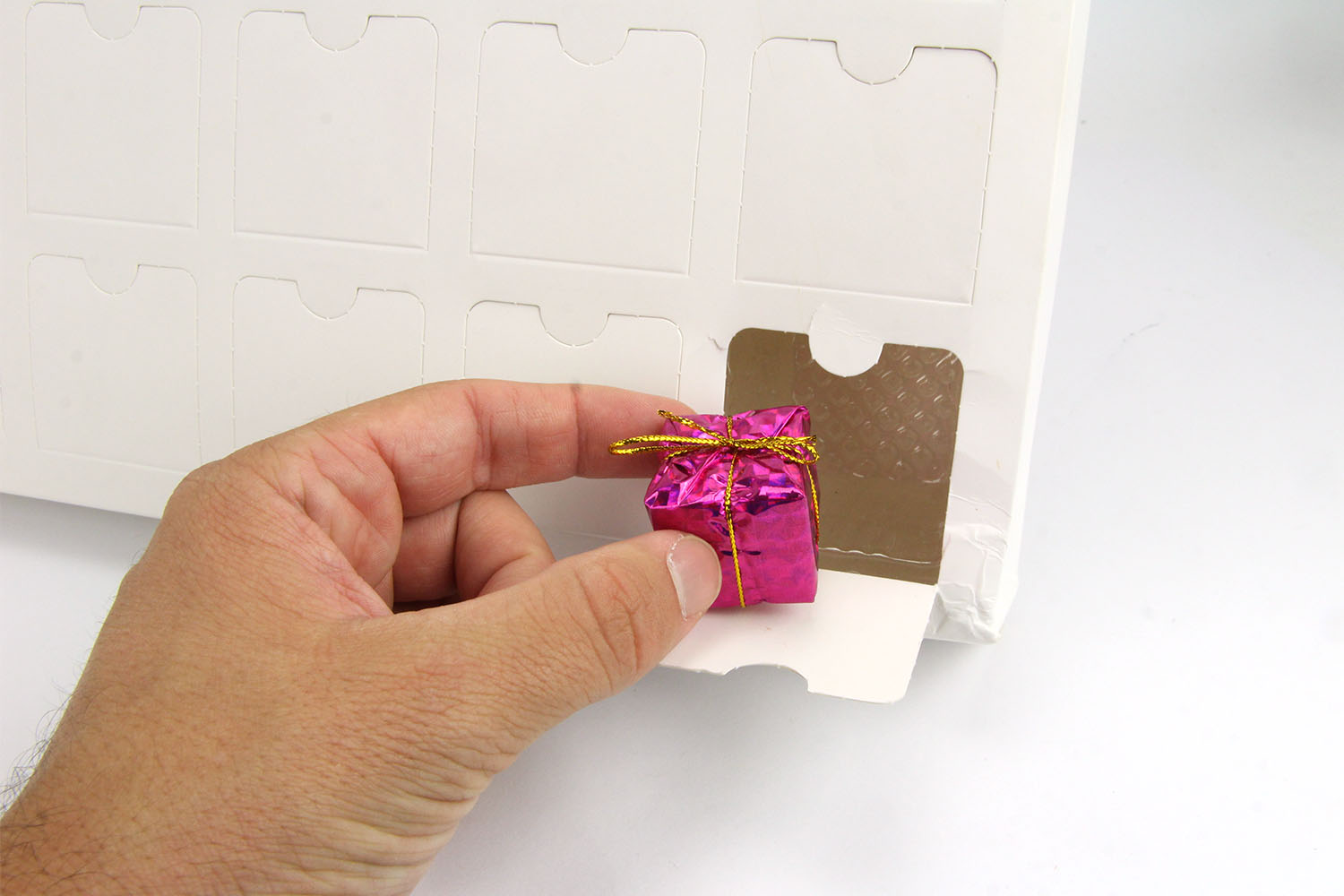 Ce calendrier dispose d'un bac en plastique compartimenté en 24 emplacements permettant de cacher chocolats, petits jouets et mots doux à l'intérieur. Toutes les cases sont prédécoupées pour en faciliter l'ouverture par les enfants.