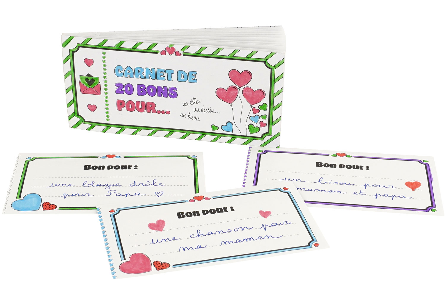 Personnalisation : Le carnet contient 7 bons déjà remplis avec des attentions adorables ("un petit déjeuner au lit", "un câlin...", "des jolies fleurs") et 13 bons à compléter pour laisser libre cours à l'imagination de l'enfant (ex. : "Bon pour un massage des pieds", "Bon pour une blague drôle").