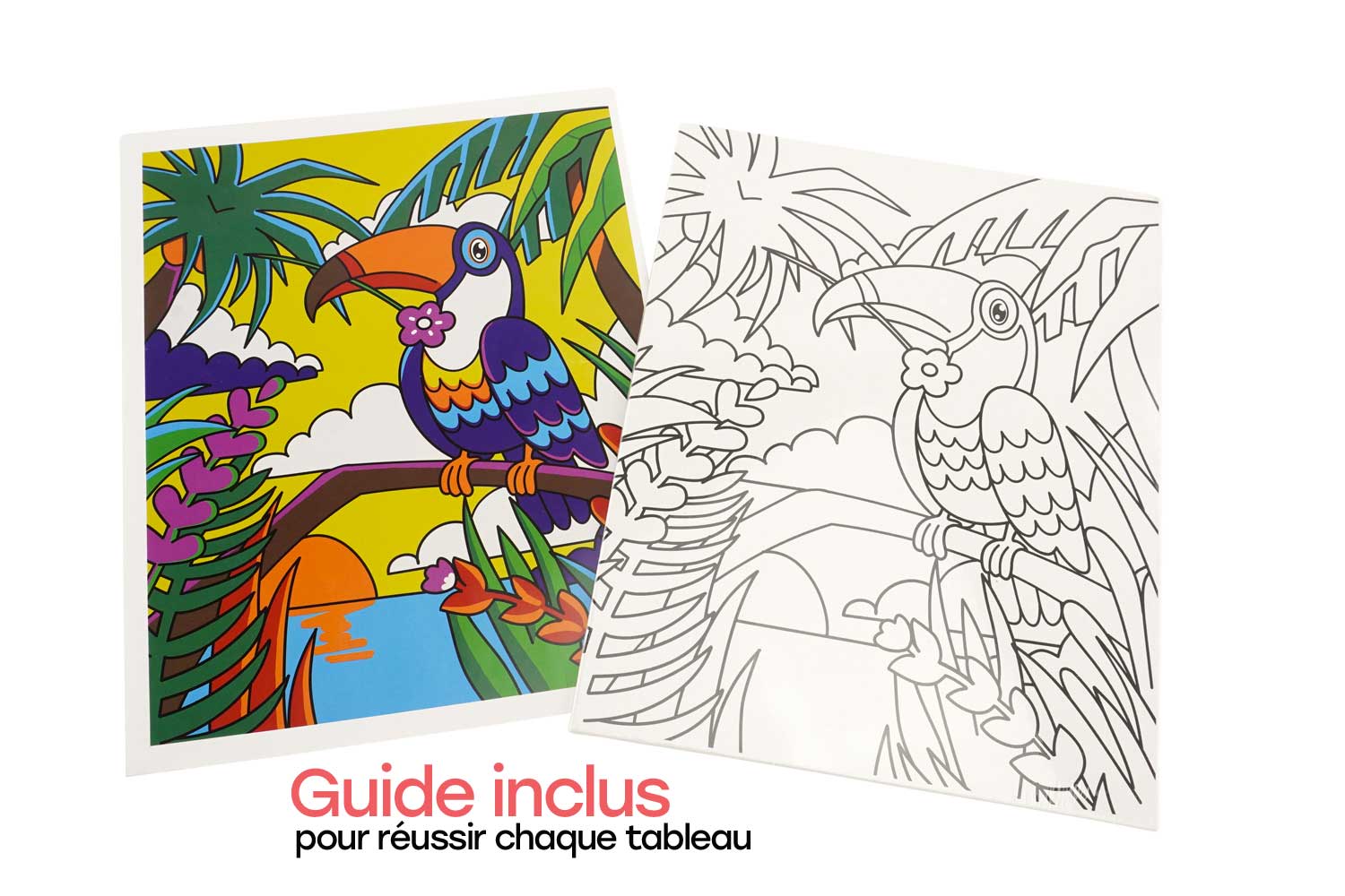 Des modèles pour s'inspirer : Le kit est livré avec 5 guides couleurs sur papier. Ces modèles aident les plus jeunes à visualiser le résultat final et à choisir les bonnes teintes pour reproduire le dessin.