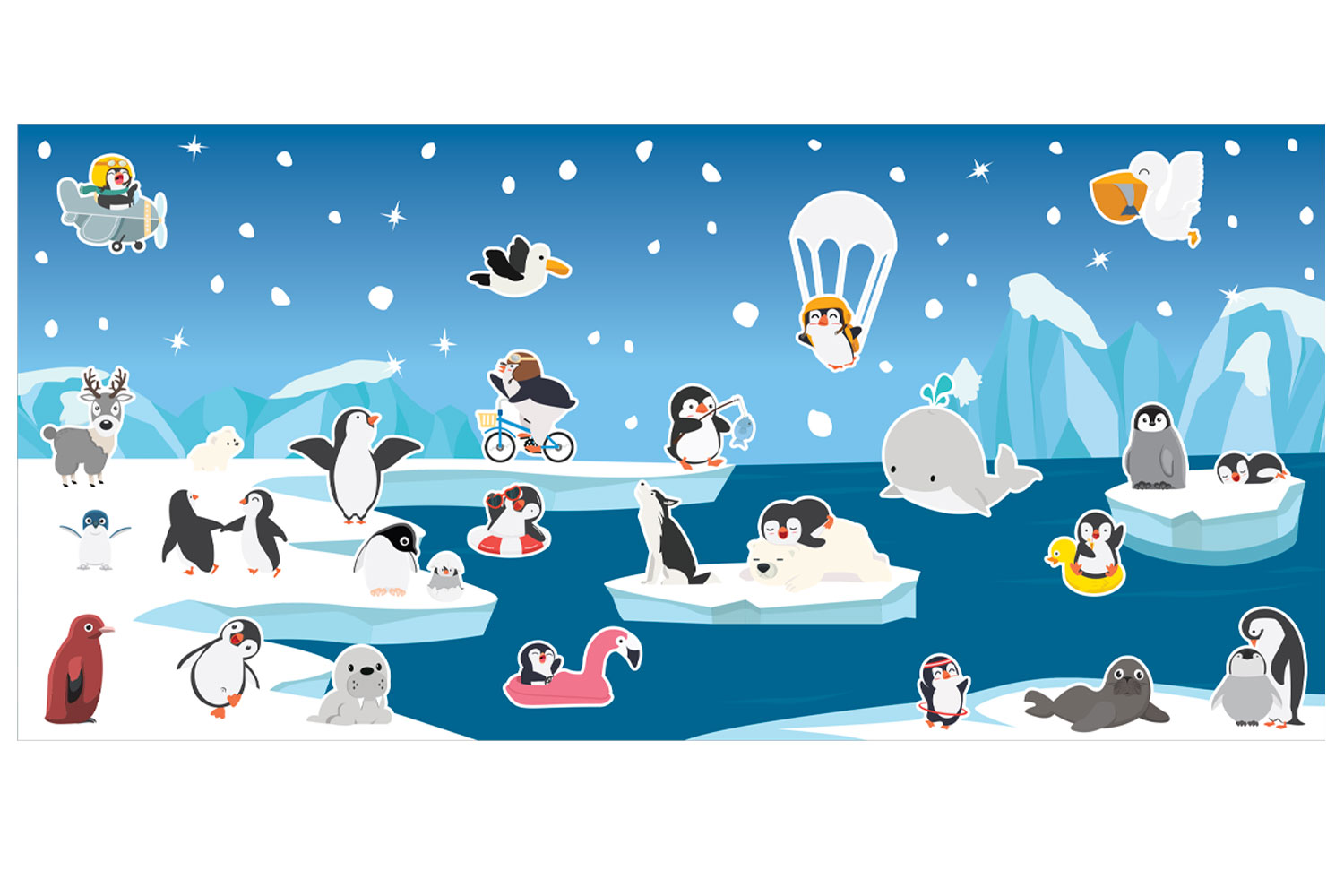 Gommettes et sa grande fresque au décor de banquise enneigé. Super activité à faire seul ou en groupe, sur ce grand décor en papier glacé de l’Arctique et de l’Antarctique, venez coller des pingouins, des manchots, des loups, des baleines, des morses, des phoques, des rennes, ours polaire, goéland voyageur. Ce magnifique décor plaira à tous les enfants passionnés du Pôle Nord et de ses animaux.