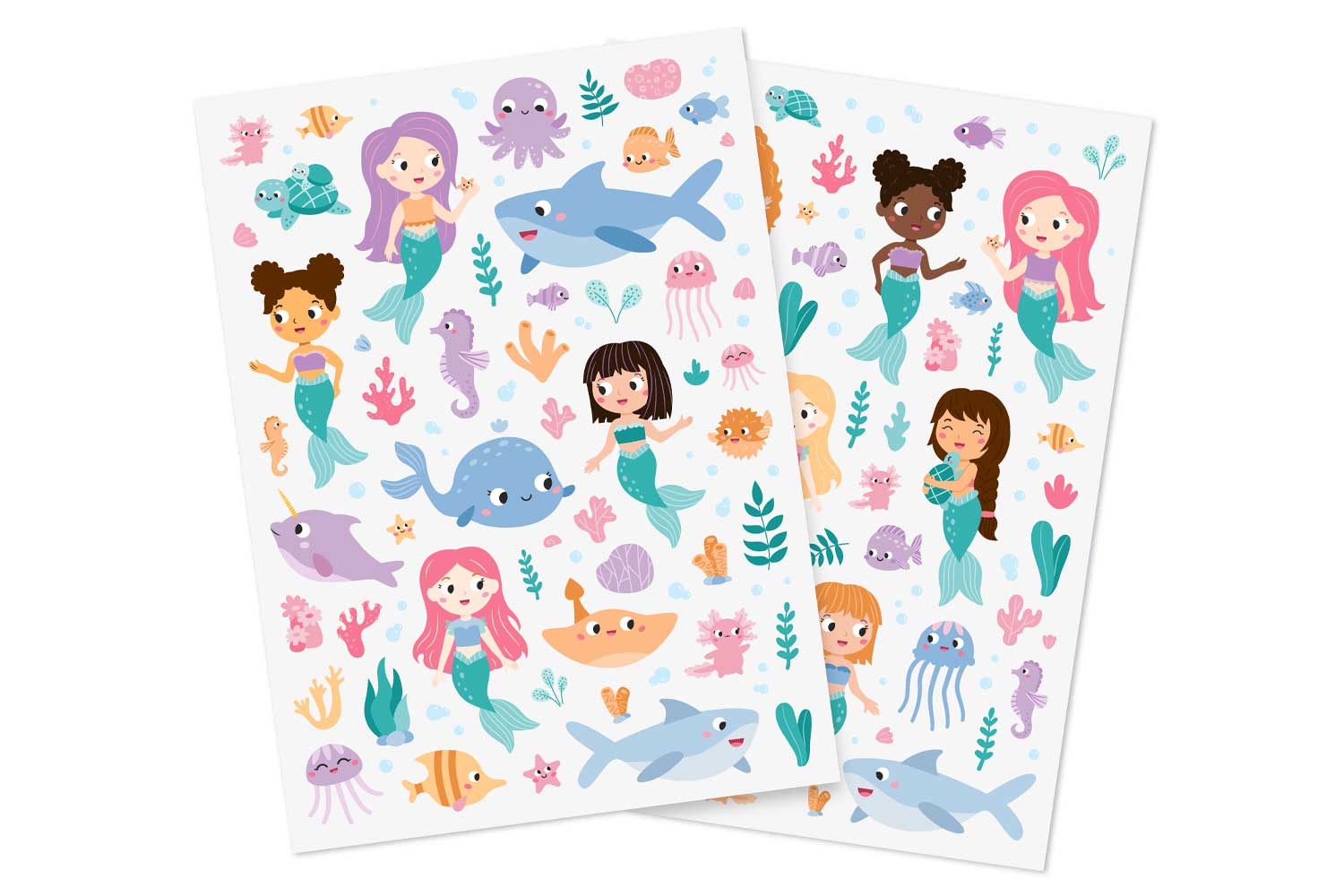Invitez les enfants à explorer un monde aquatique féerique avec ce kit complet de gommettes sur le thème des sirènes et de la mer. Ces planches regorgent de personnages adorables et d'éléments marins variés : des sirènes gracieuses aux requins rigolos, en passant par les baleines, les poissons colorés, les coquillages et les algues.