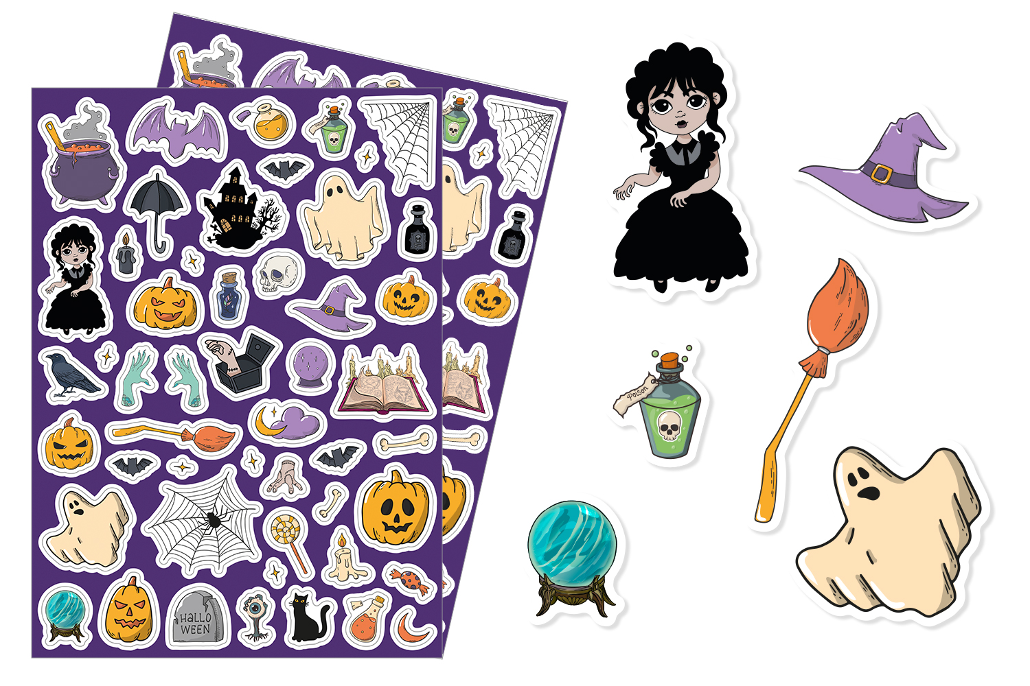 Ajoutez une touche ensorcelante à vos créations avec ces gommettes “Sorcières et magie”, inspirées par l'univers de Mercredi Addams. Ces deux planches identiques regorgent de motifs détaillés tels que des sorcières, des fantômes, des citrouilles et bien plus encore, parfaits pour des projets créatifs à l'ambiance mystique.
