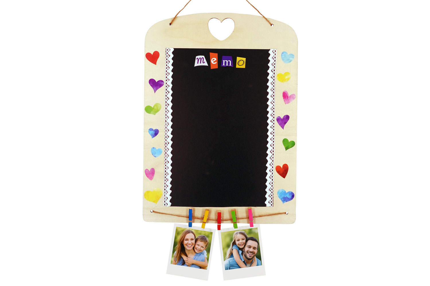 - Placez le panneau en bois bien à plat sur une table propre et dépoussiérée pour garantir une bonne adhérence des adhésifs. Veillez à ce que la découpe en forme de cœur soit positionnée vers le haut.