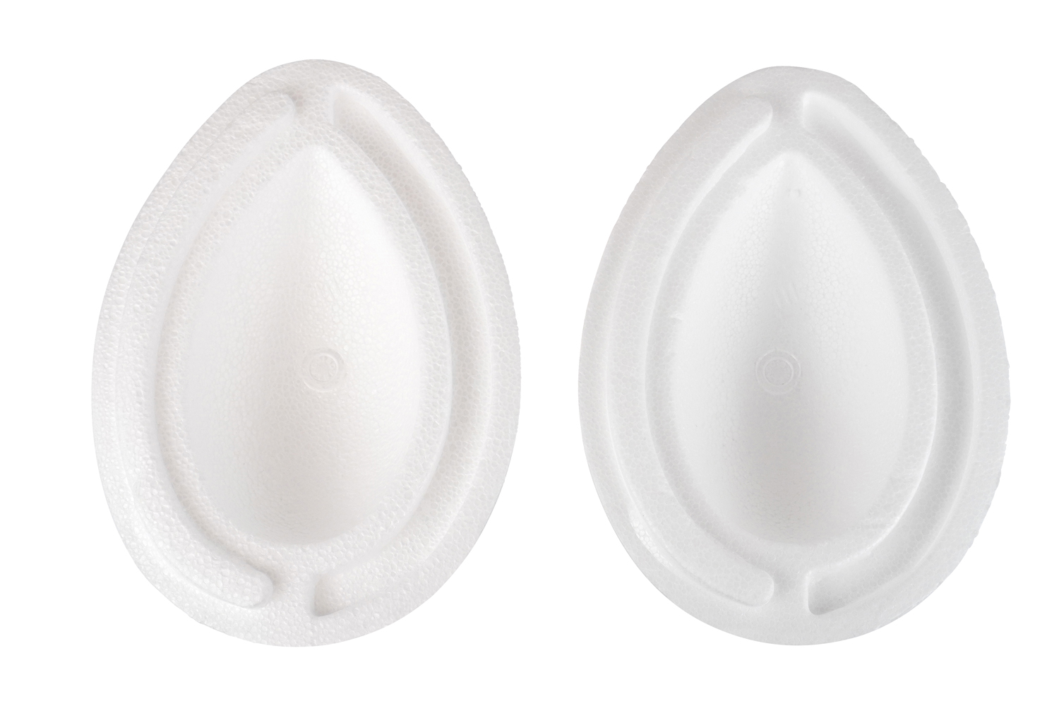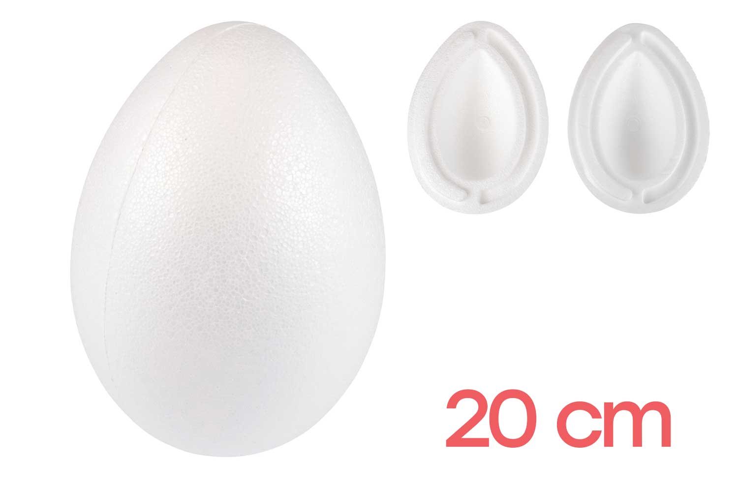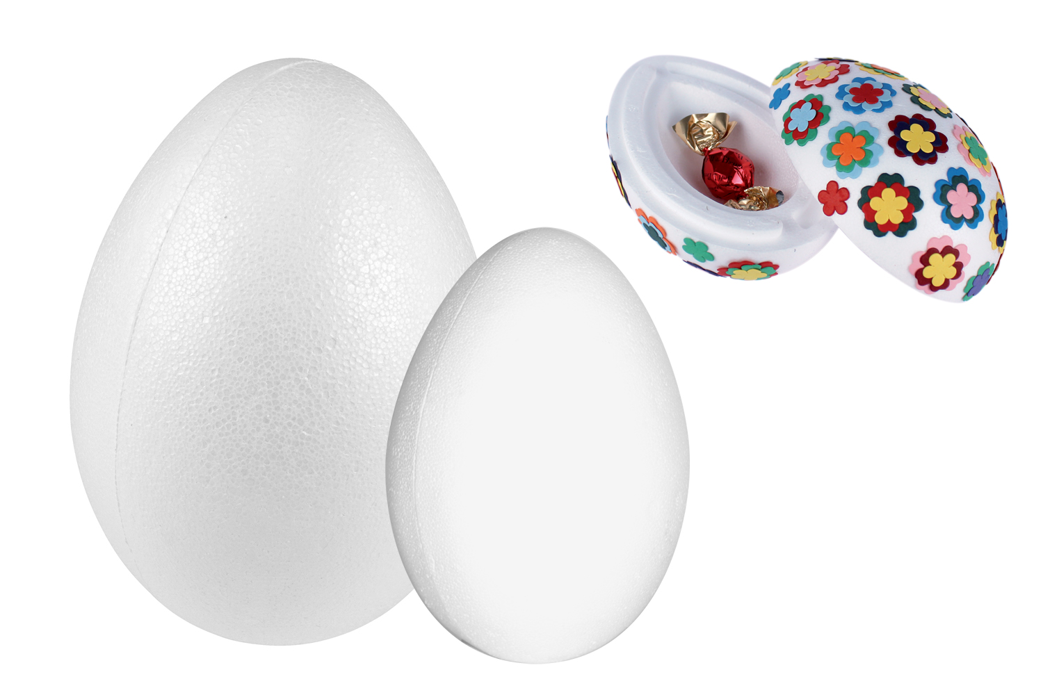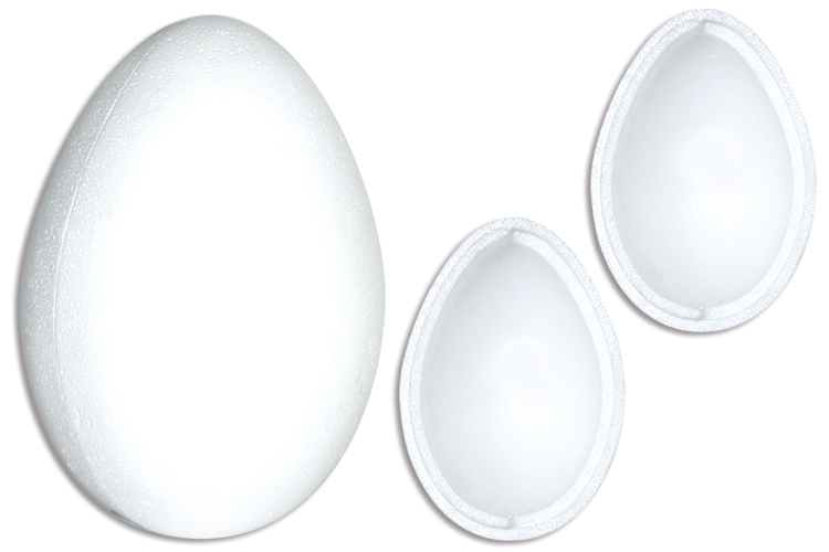 Grand oeuf en polystyrène en 2 parties emboîtables à fixer avec de la pâte adhésive (patafix). À remplir de chocolat de Pâques et à décorer avec de la peinture, du papier à coller, des strass ou des sequins.
