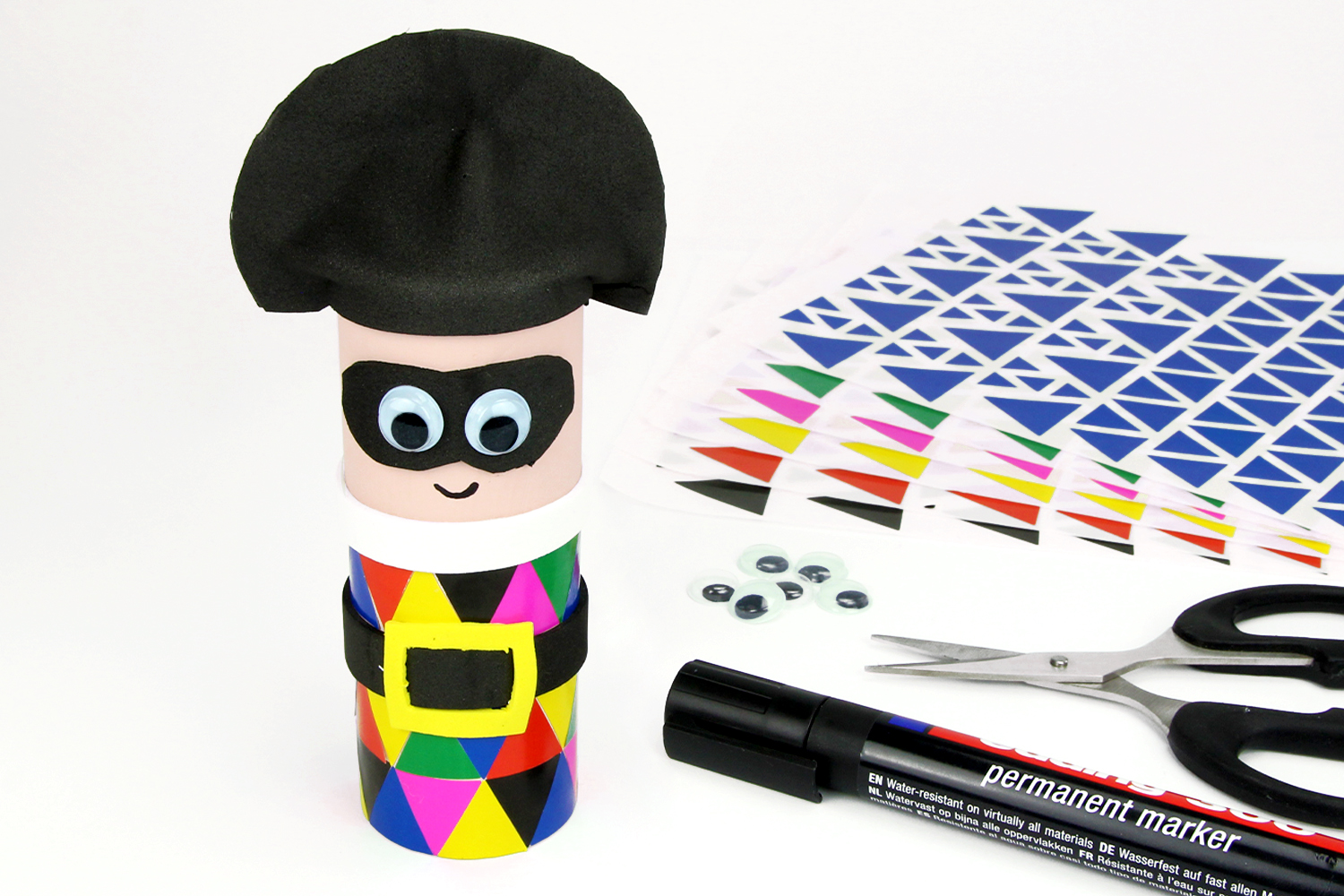Grâce à un rouleau en carton, du caoutchouc mousse et des gommettes les enfants pourront s'amuser à fabriquer un Arlequin trop rigolo pour fêter le carnaval.