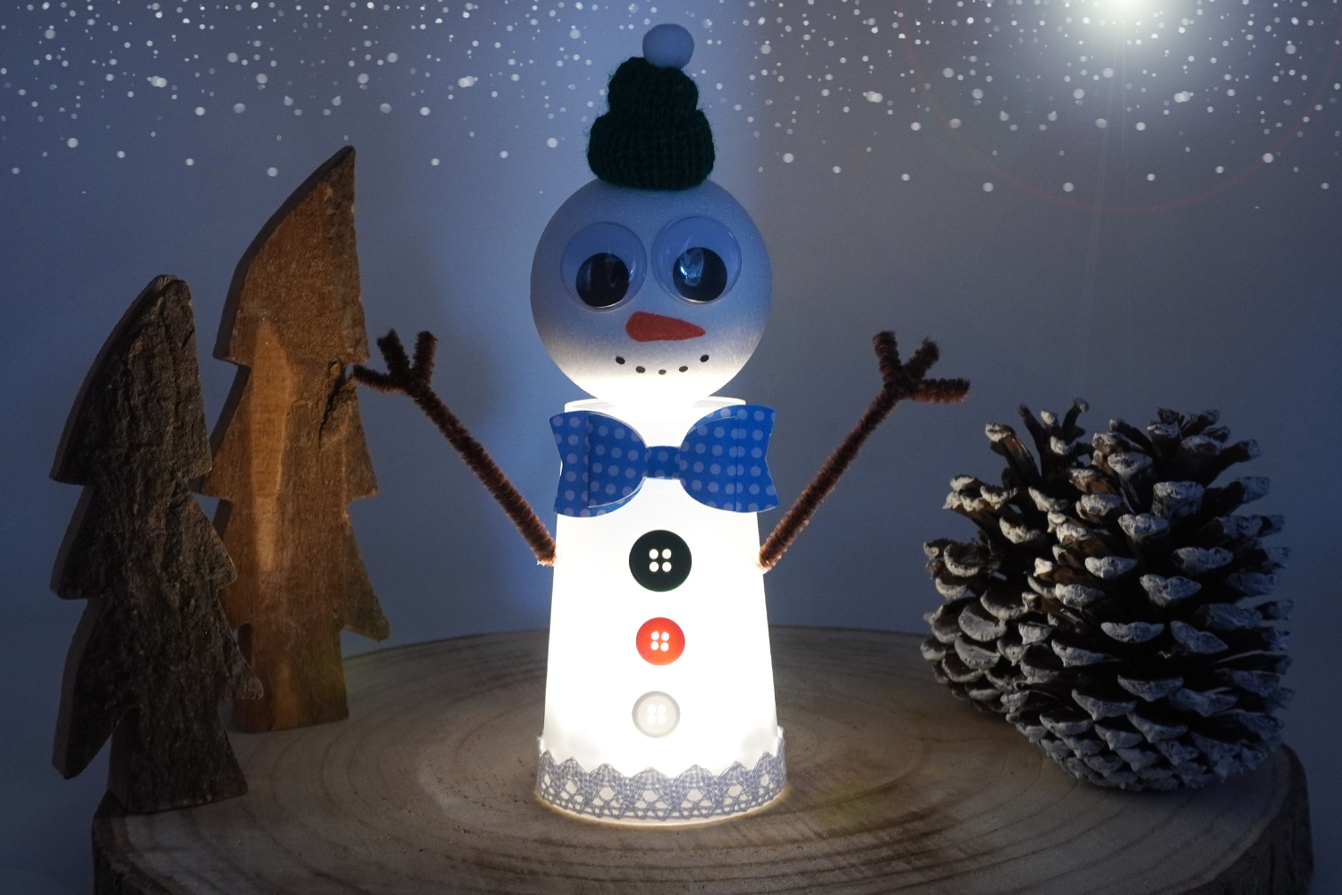 Placer une bougie LED puissante sous le gobelet pour éclaire le bonhomme de neige.