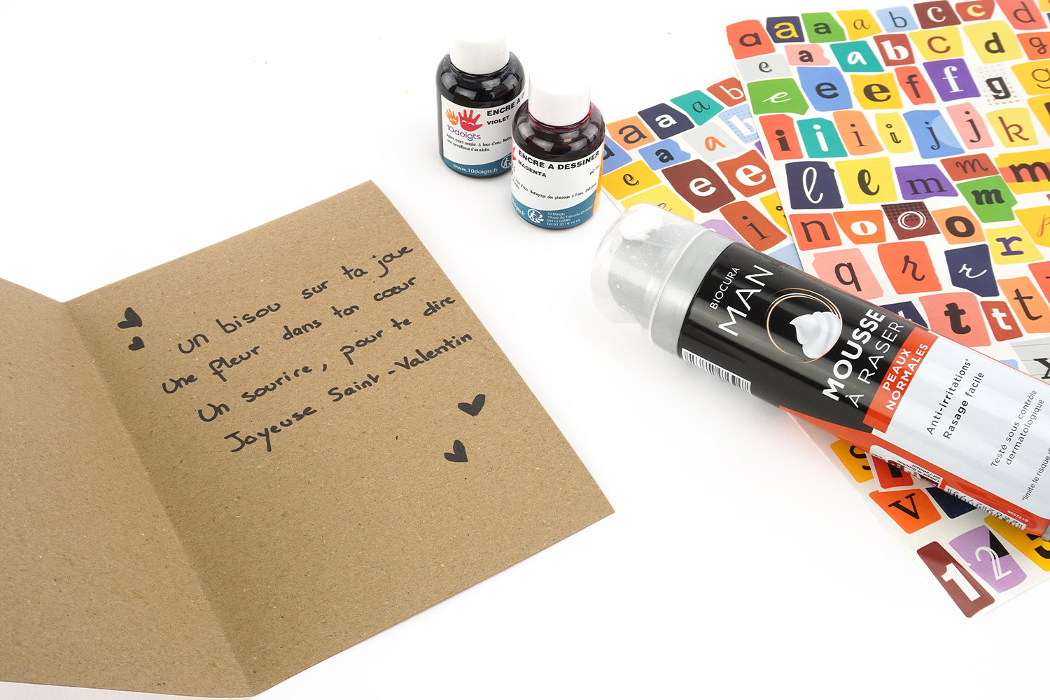 Coller des gommettes lettres pour écrire "Saint-Valentin".