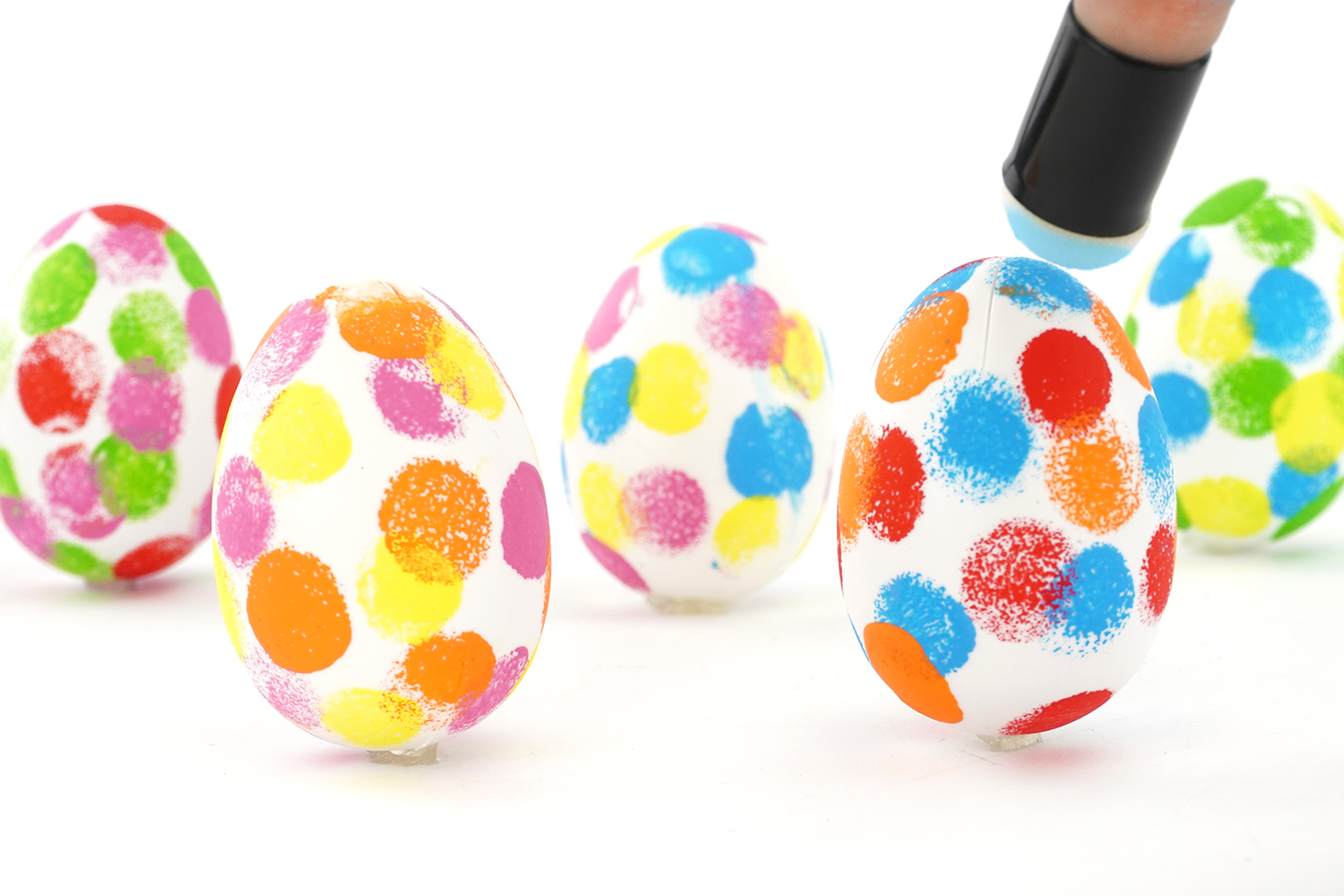 Tenir un œuf par sa tige en bois, puis taponner des points de plusieurs couleur à l'aide des tampons à doigts