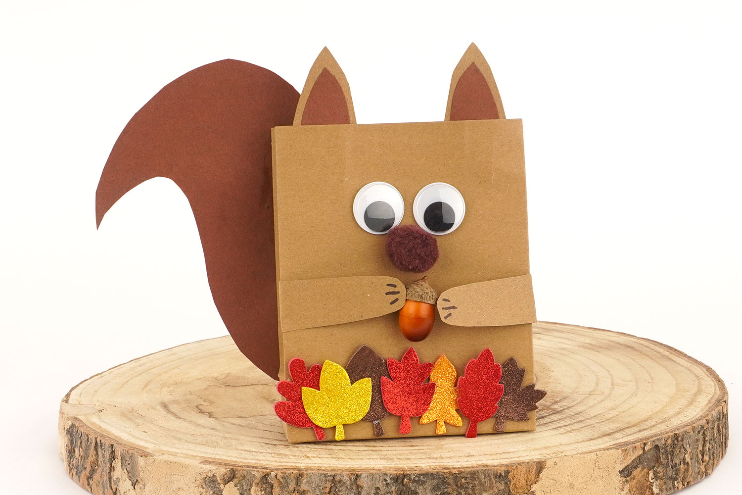 Pour une activité de bricolage d’automne simple et ludique, créez un adorable écureuil à partir d’un sac en papier kraft, de papier coloré, de feuilles pailletées et d’un petit gland décoratif.
