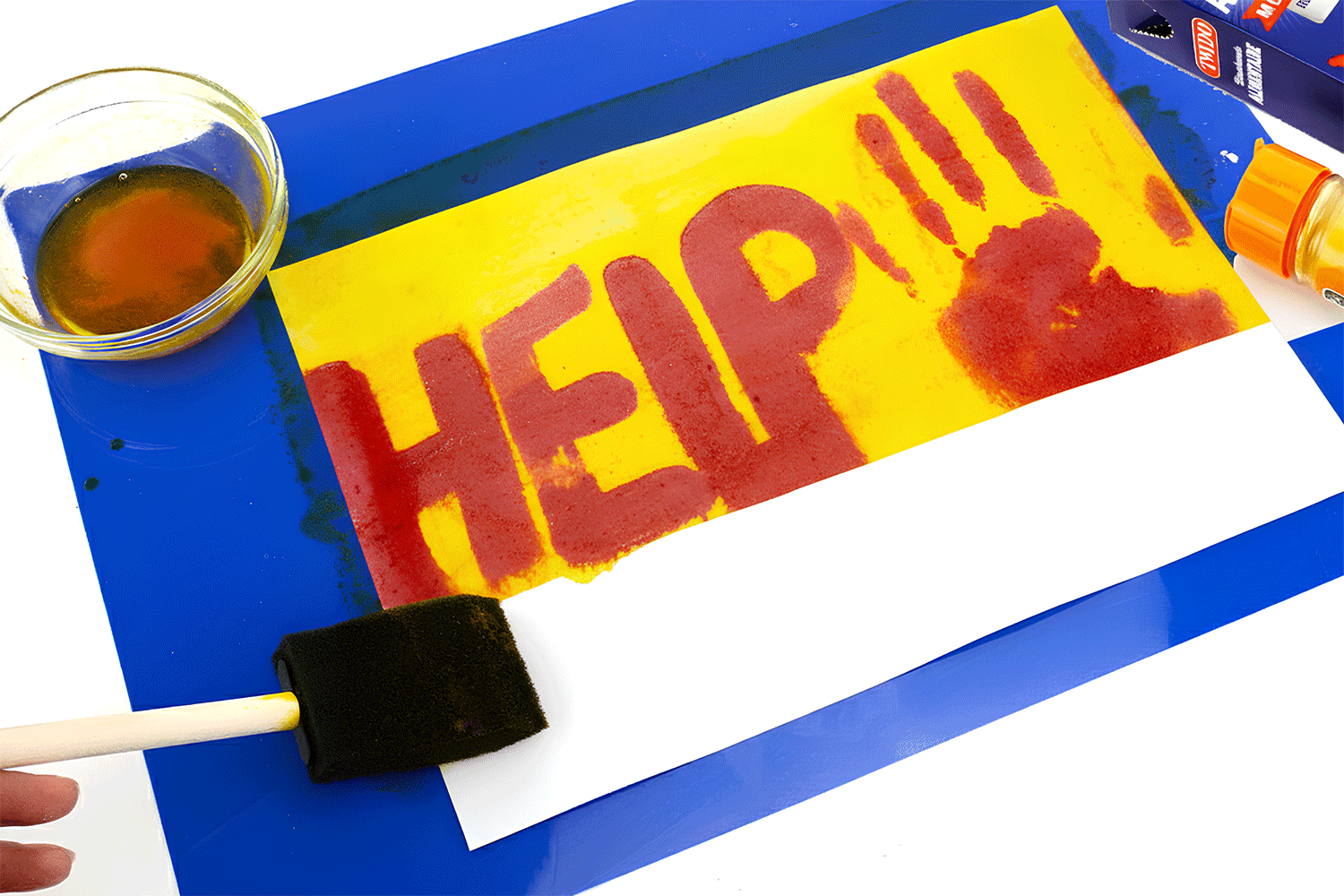 À l’aide d’un pinceau mousse, passer le mélange au curcuma sur toute la feuille afin de révéler les dessins.