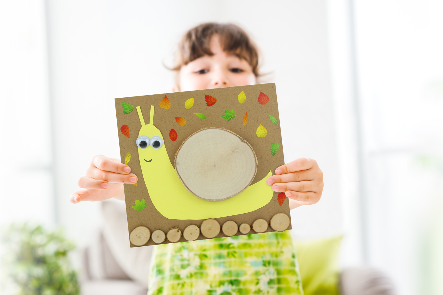 Avec des rondelles de bois, un peu de papier et des gommettes les enfants utiliseront les techniques de collage et découpage afin de réaliser un sublime tableau escargot sous une pluie de feuilles aux couleurs de l'automne.