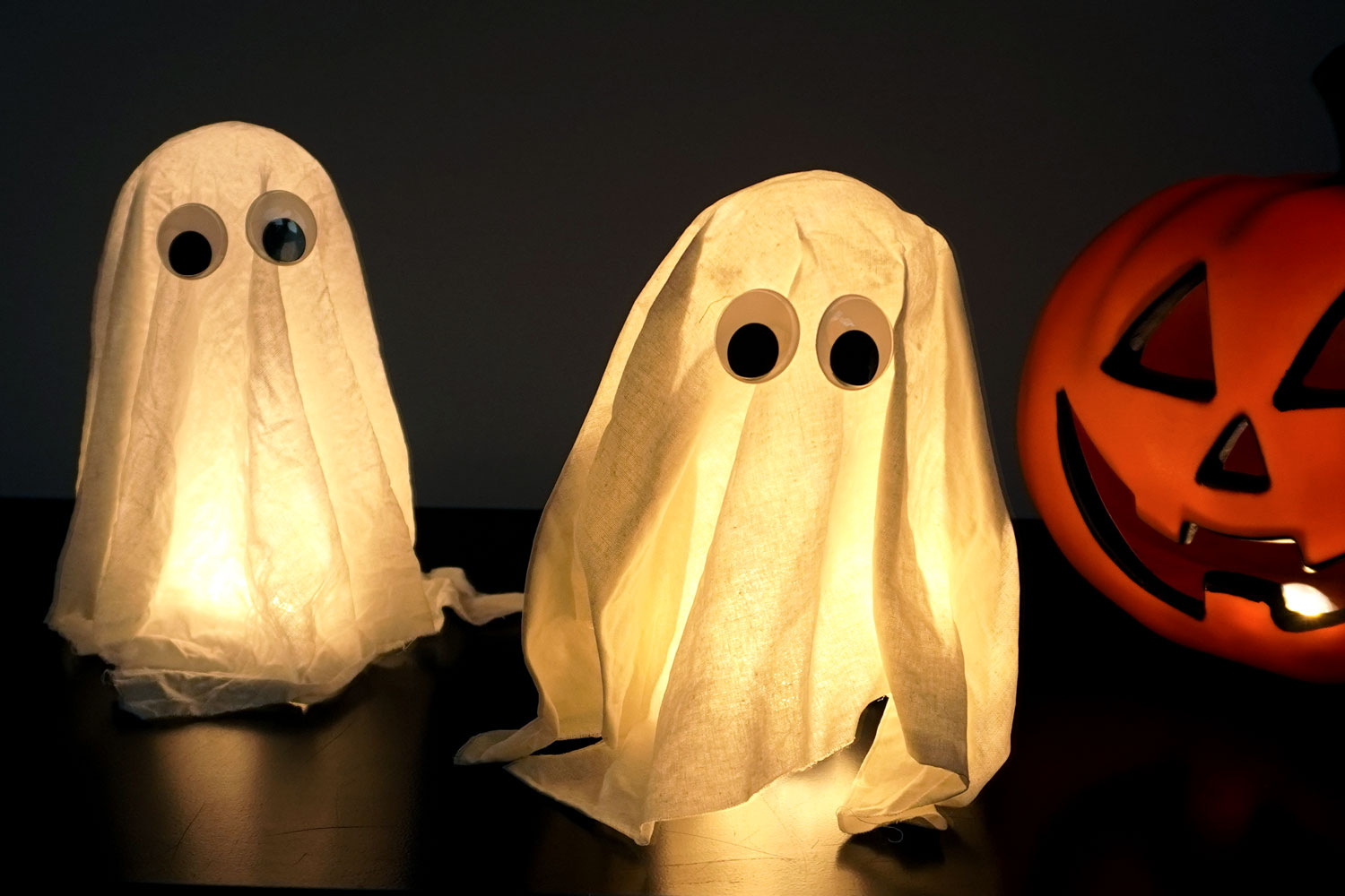 Un coupon de tissu blanc, de la colle blanche vinylique et deux yeux mobiles suffiront à réaliser cette jolie décoration d'Halloween. Le tissu est imbibé de colle, puis déposé sur un support pour sécher et prendre une forme fantomatique. Une fois durci, il ne reste qu’à coller les yeux : effet garanti !