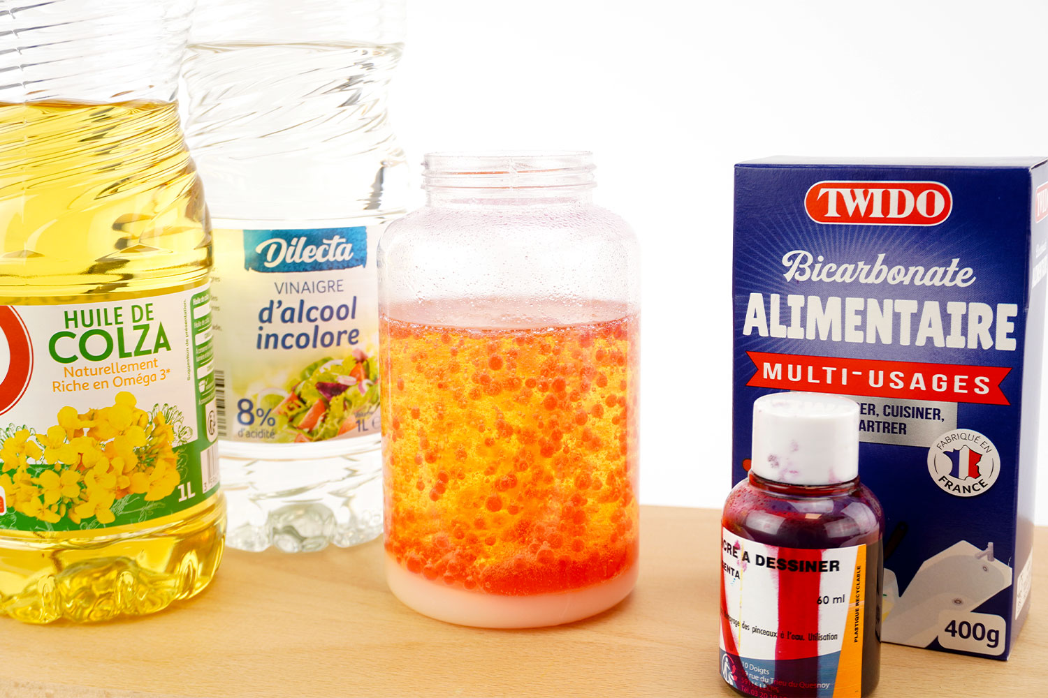 Regarder les bulles colorées remonter et descendre dans l’huile comme dans une vraie lampe à lave. Lorsque les bulles touchent le bicarbonate, une nouvelle réaction se produit.