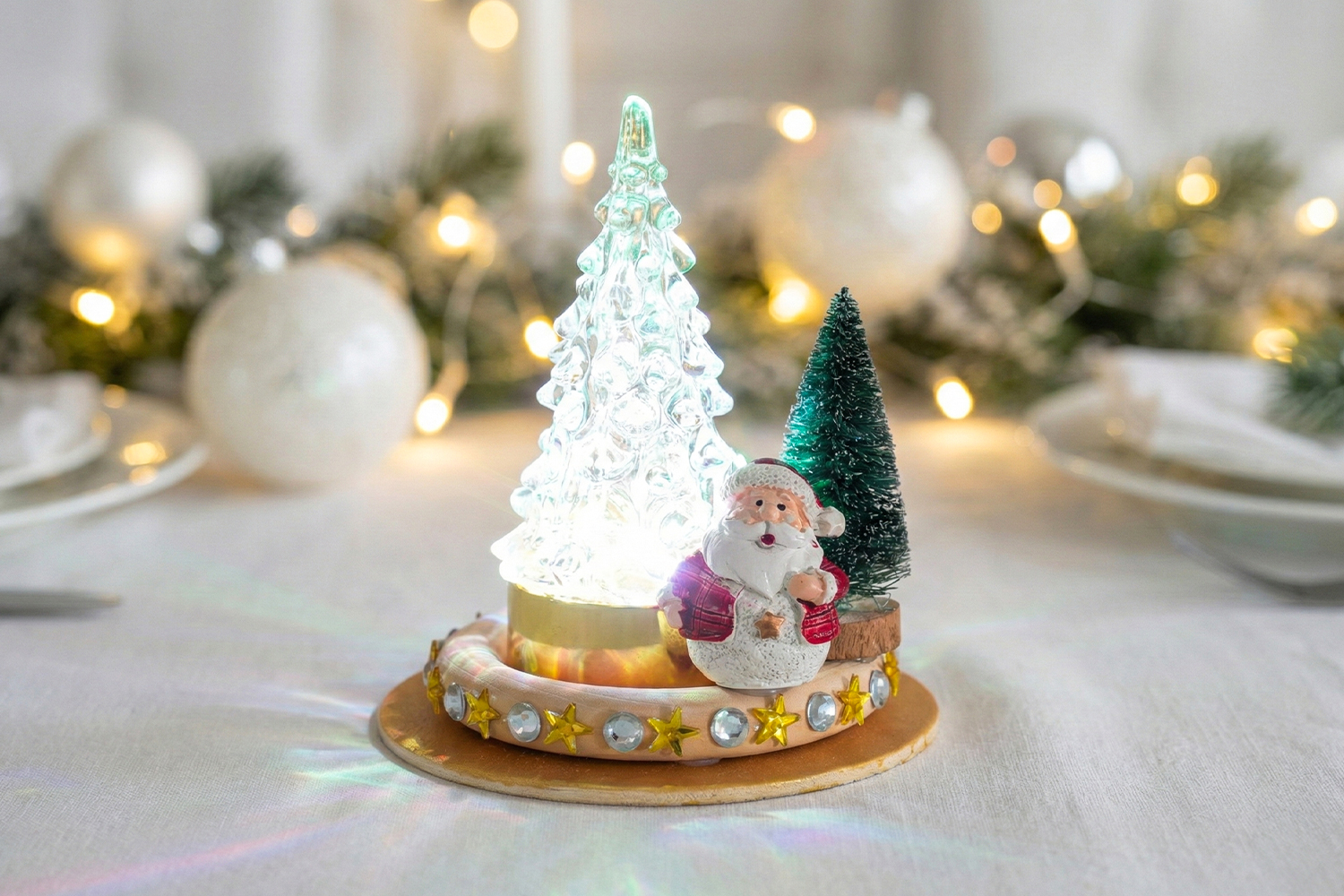 Ils commencent par colorier la base en bois, puis décorent l’anneau avec des strass brillants. Après avoir collé les éléments ensemble, ils ajoutent un Père Noël, un petit sapin enneigé et placent enfin le sapin lumineux au centre pour créer une scène magique !
