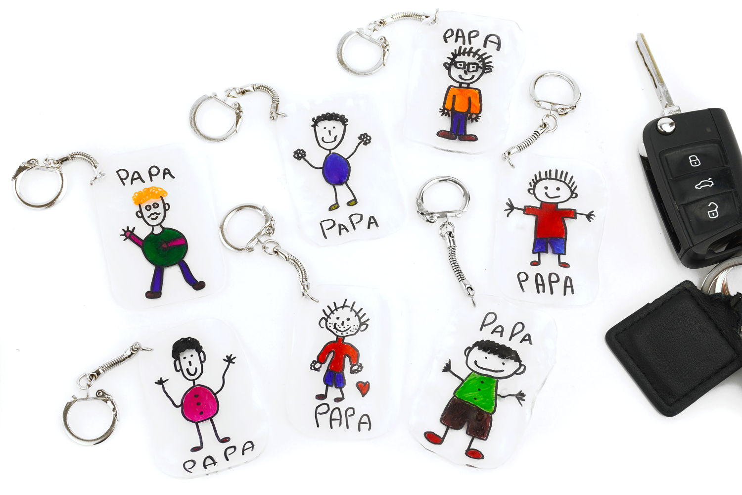 Grâce à notre plastique fou (appelé aussi plastique dingue), transformez facilement le dessin de vos enfants en un porte-clés unique et durable. Ce cadeau personnalisé est le moyen idéal de montrer à papa combien il est spécial pour ses enfants.