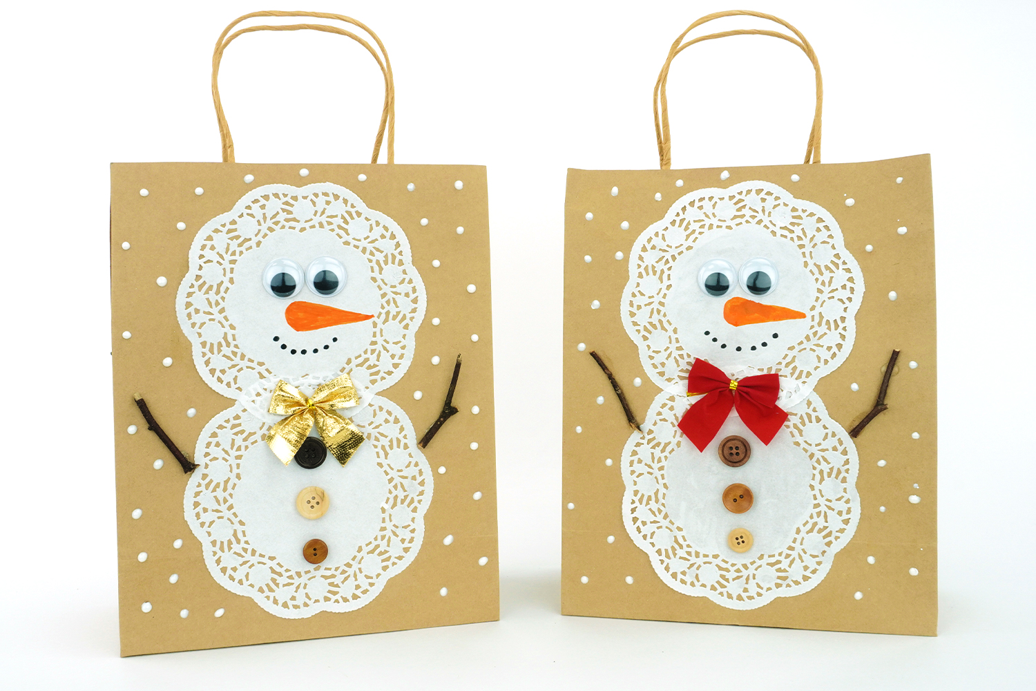 Pour cette activité de Noël, nous allons utiliser des sacs en papier kraft afin de fabriquer de jolis emballages avec des bonhommes de neige !