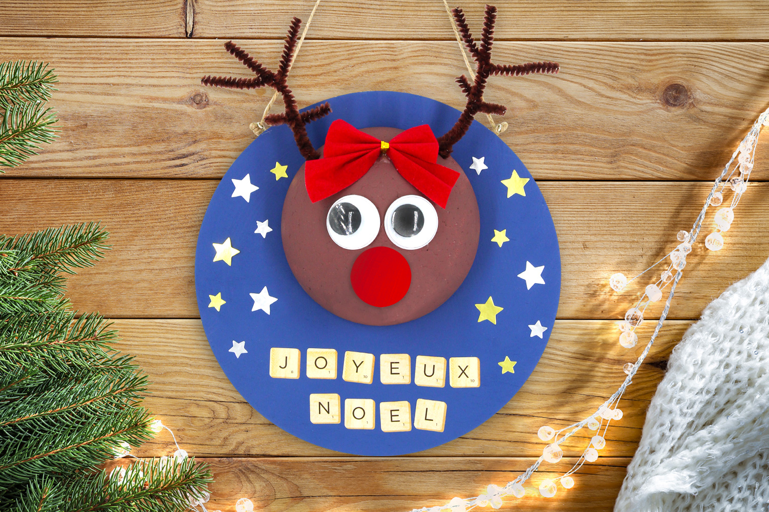 Coller des gommettes scrabble en dessous du renne pour former "Joyeux Noël".
