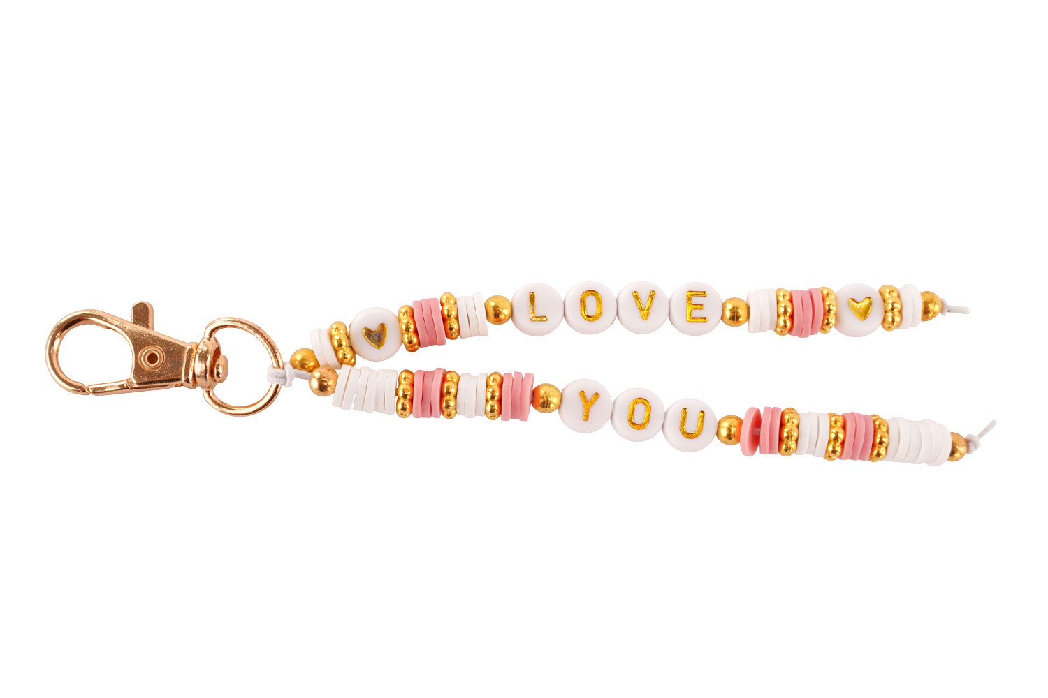 Créez de magnifiques bijoux "Love you" personnalisés avec ce kit complet aux tons blancs, roses et dorés. Composé de perles délicates et d'accessoires assortis, il permet de réaliser deux porte-clés ou breloques à accrocher à un sac à main ou à offrir.