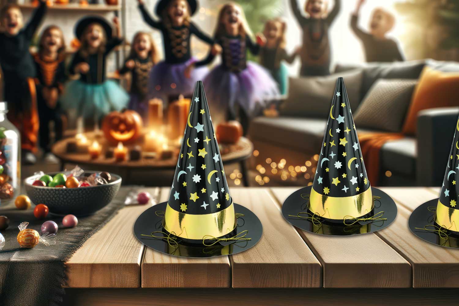 Kit créatif chapeaux surprises à personnaliser pour Halloween. Permet de réaliser 4 adorables chapeaux de sorcière, pour ensuite les remplir de délicieux bonbons !