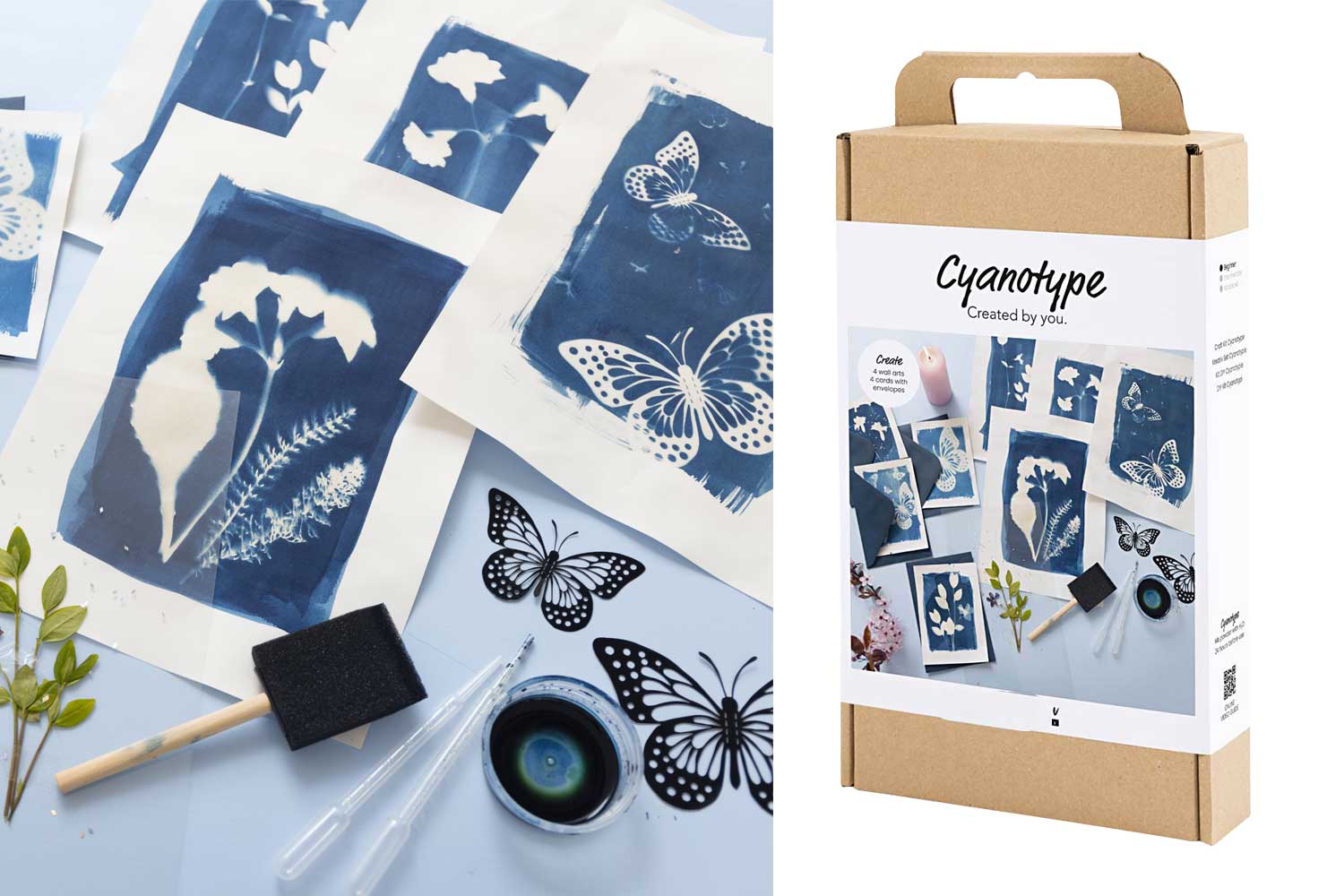 Initiez-vous à la technique artistique du cyanotype grâce à ce kit complet contenant tout le nécessaire pour réaliser environ 200 impressions (Format A5) uniques et créatives. Le cyanotype, procédé photographique ancien, permet d’obtenir des images d’un bleu intense grâce à une réaction à la lumière du soleil.