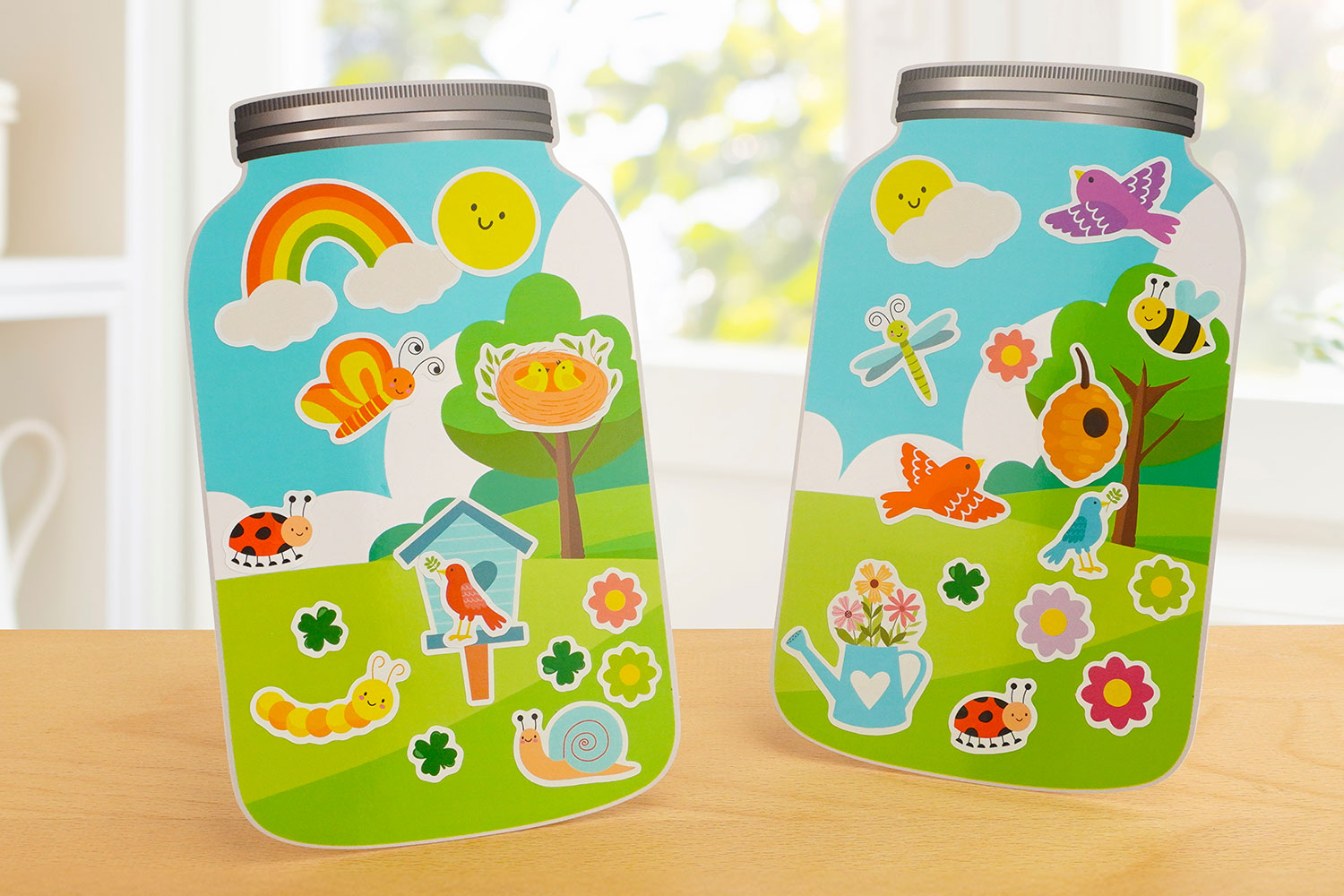 Chaque enfant utilise un bocal en carte forte pré-imprimé représentant un paysage verdoyant avec un bel arbre et un ciel bleu. Puis grâce aux planches de gommettes fournies, les petits créateurs personnalisent leur bocal en y ajoutant des fleurs, des oiseaux, des papillons, des escargots et même des arcs-en-ciel.
