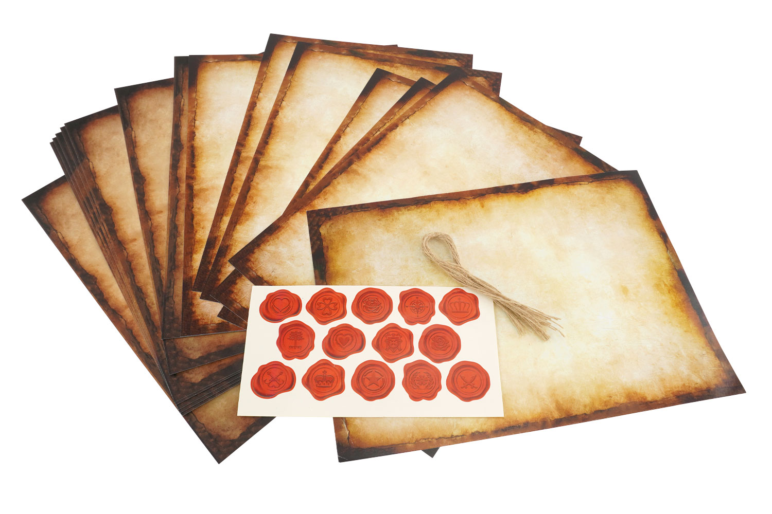 Donnez un rendu ultra-réaliste et historique à vos messages et invitations avec le Set de 14 Cartes Légères "Vintage" effet parchemin ! Ce kit est parfait pour les fêtes à thème, les chasses au trésor, une lettre au Père Noël ou les correspondances originales.