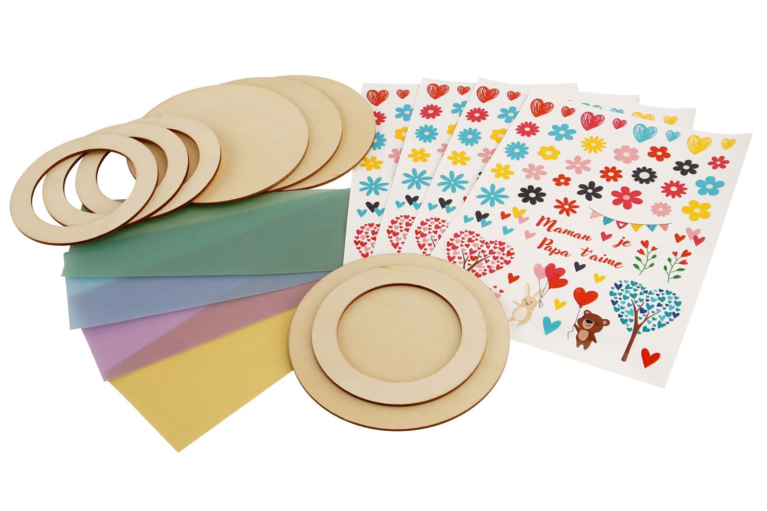 En quoi consiste l'activité ? Ce kit est un projet de collage, de composition et de décoration qui donne un résultat lumineux. L'enfant décore un cylindre de papier calque coloré qui, une fois fixé sur un socle en bois, devient un photophore.
