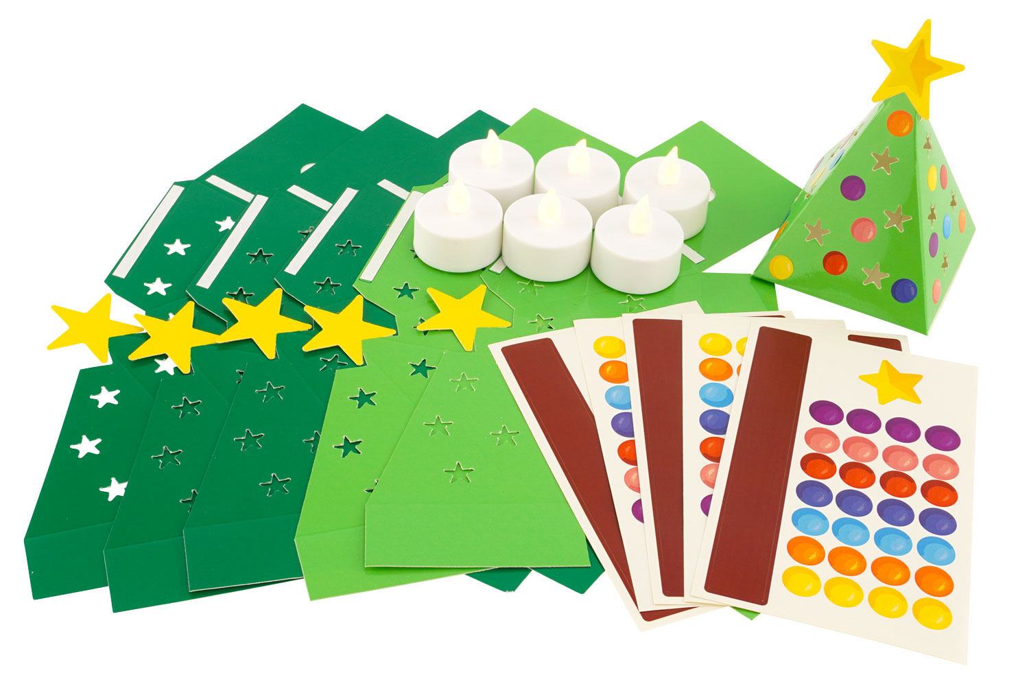 Créez des sapins de Noël scintillants en toute simplicité avec ce kit créatif tout inclus ! Ces petits sapins en carton se montent en un clin d’œil, se parent de gommettes colorées, puis s’illuminent grâce à une bougie LED incluse, sans flamme et sans danger. Une activité manuelle simple, créative et sécurisée, parfaite pour les ateliers en famille, en classe ou en centre de loisirs.
