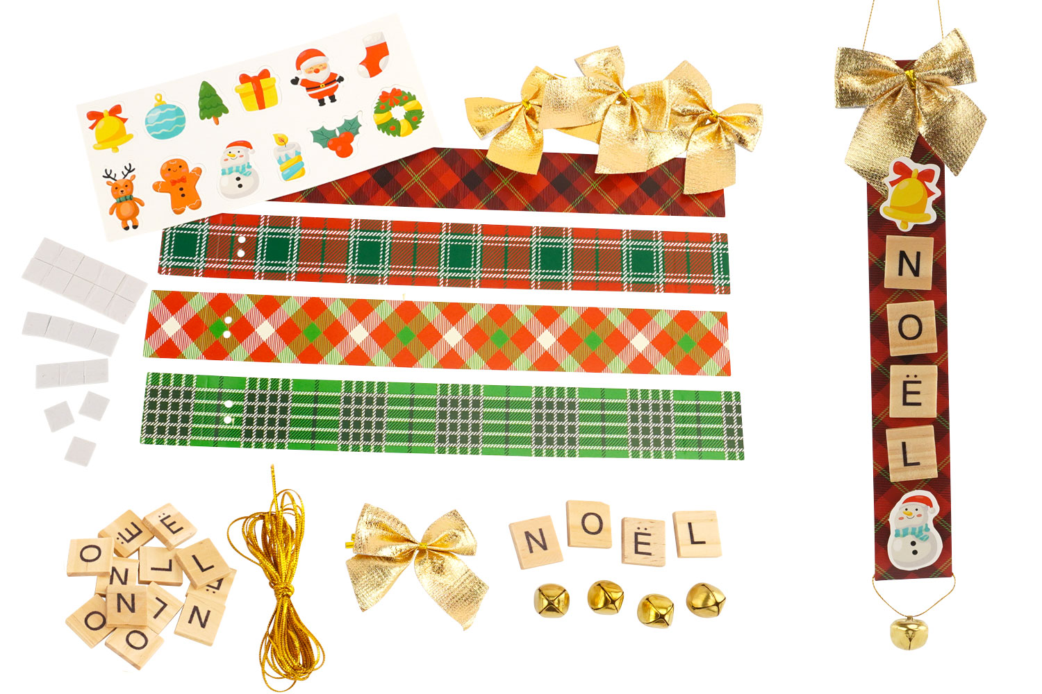 Apportez une touche artisanale et chaleureuse à votre sapin avec ce kit créatif de suspensions de Noël. Ce produit complet permet de fabriquer 4 décorations uniques mêlant tradition et modernité, grâce à l'utilisation de matériaux nobles comme le bois et de motifs festifs indémodables. La personnalisation est au cœur de cet article avec ses lettres en bois façon Scrabble qui forment le mot "NOËL"; ajoutant une dimension ludique et authentique à votre décoration de fêtes.