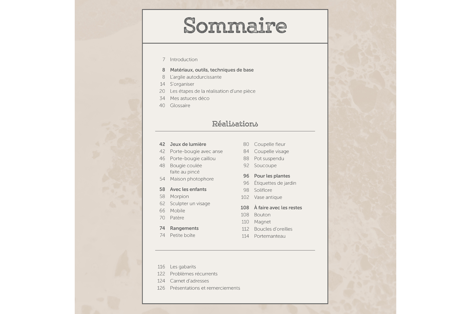 Livre sur le modelage sans cuisson et sans tour, pour réaliser 20 projets à reproduire facilement. Initiez-vous aux joies de la poterie sans besoin de four de potier, ou de matériaux couteux ! Ce livre vous propose des projets créatifs et vous fait découvrir toutes les astuces du modelage à l'argile sans cuisson pour réaliser des objets du quotidien : vase, bougeoir, photophore, jeux à faire pour les enfants, boites, coupelles, soliflores, boutons, bijoux, ou encore magnets.