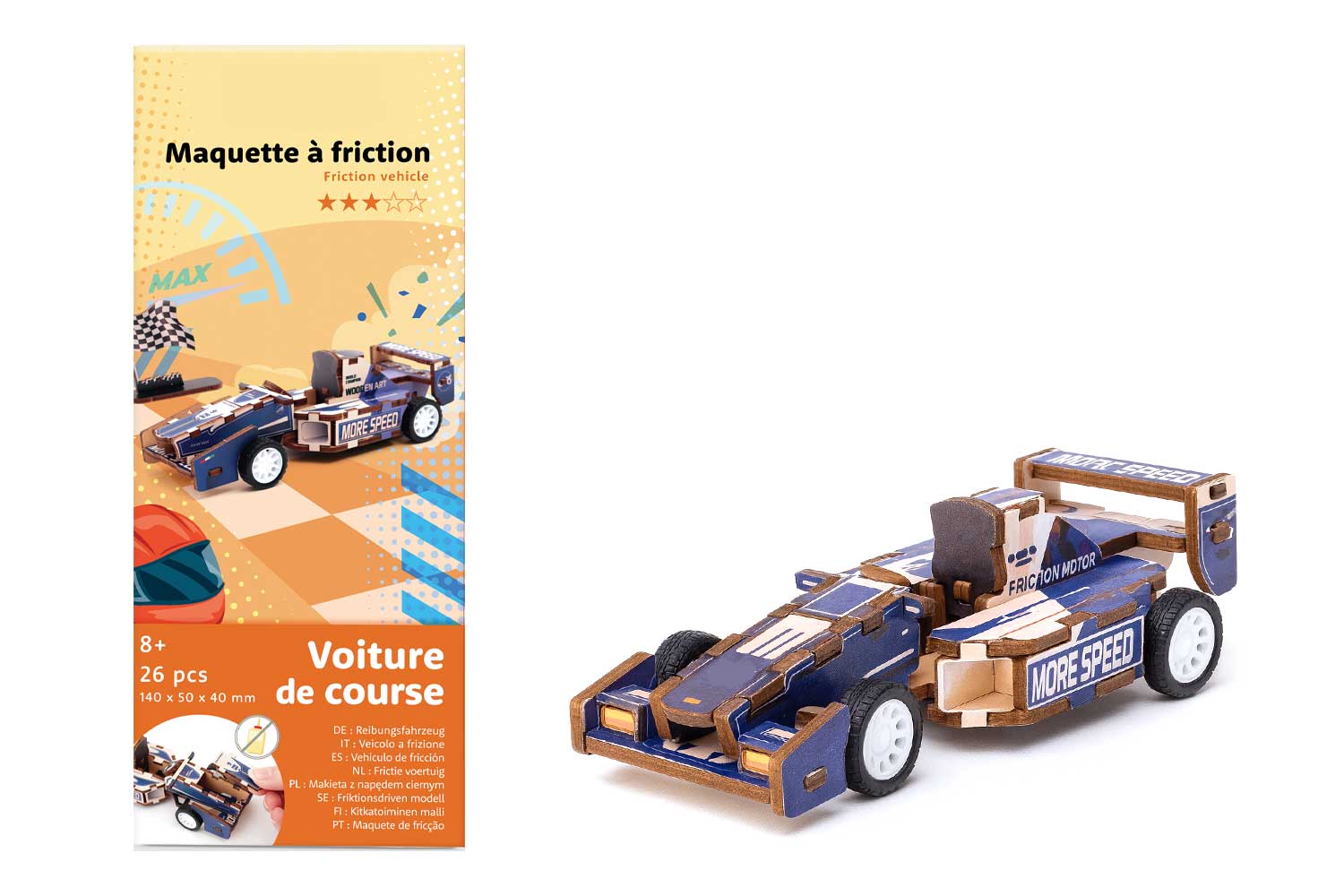 Faites vibrer les amateurs de vitesse avec ce kit de maquette en bois à friction représentant une voiture de course stylisée. Idéal dès 8 ans, ce modèle ingénieux se monte facilement grâce à des pièces en bois prédécoupées et un mécanisme à friction efficace. Pas besoin de colle ni d’outils compliqués. Une simple traction permet à la voiture de démarrer seule, procurant un vrai moment de surprise et d’amusement.
