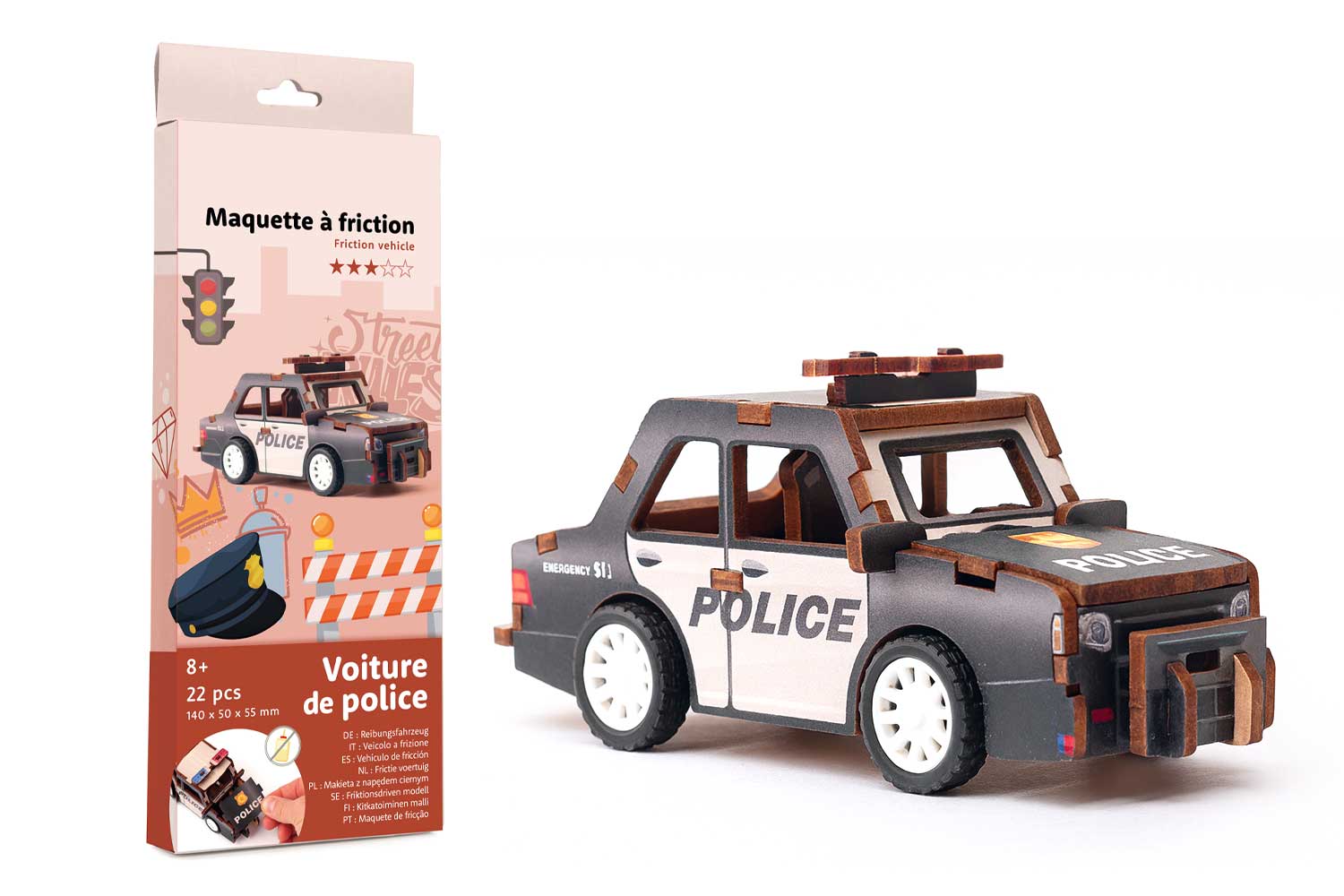Donnez vie à l’univers des forces de l’ordre avec ce kit de maquette en bois à friction représentant une voiture de police. Adapté aux enfants dès 8 ans, ce kit ingénieux se compose de 22 pièces prédécoupées en bois. Le montage est accessible et sans colle ni ciseaux, parfait pour les jeunes créatifs en autonomie ou en atelier avec les parents.