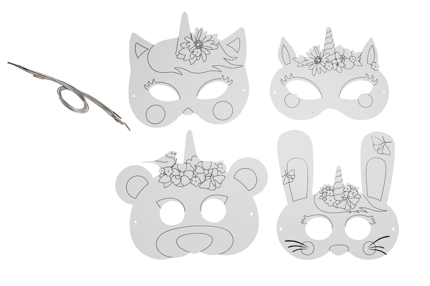Ces adorables animaux (lapin, ours, et chat) sont parés d'une corne de licorne et de fleurs dessinées pour apporter une touche féerique à chaque masque.