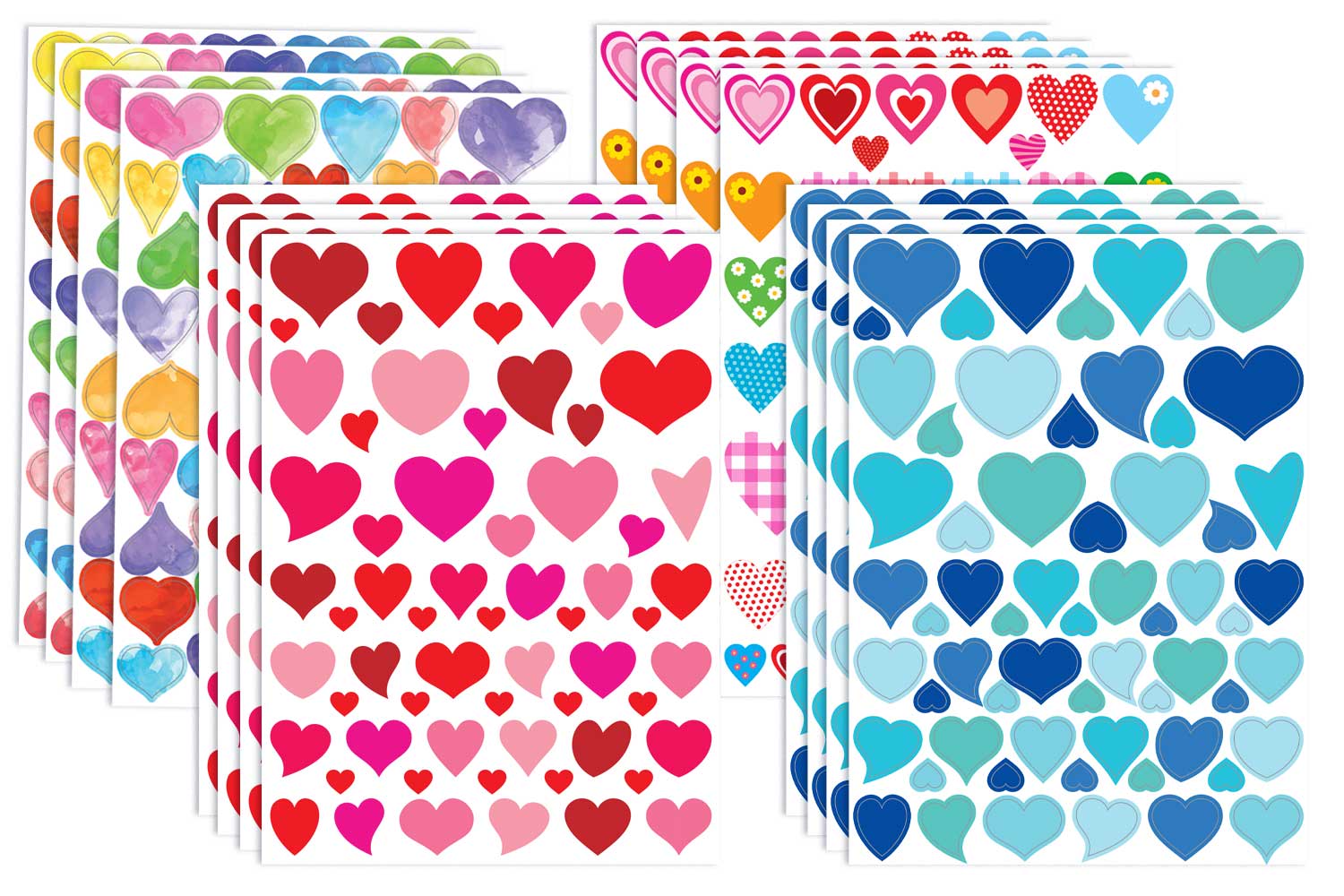 - Cœurs “Aquarelle” : 2 planches différentes, 116 gommettes. Tailles : 1,4 à 2,8 cm