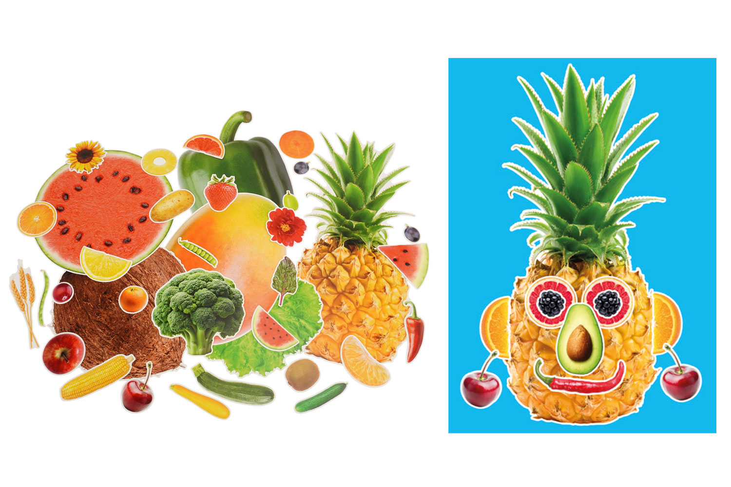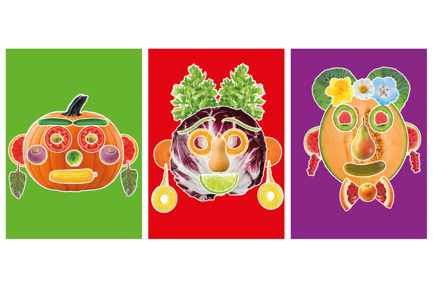 - Assemblage : L'enfant choisit une base (comme une tranche de pastèque ou un potiron) pour former le visage, puis ajoute des détails (yeux en cerises, nez en carotte, cheveux en brocoli).