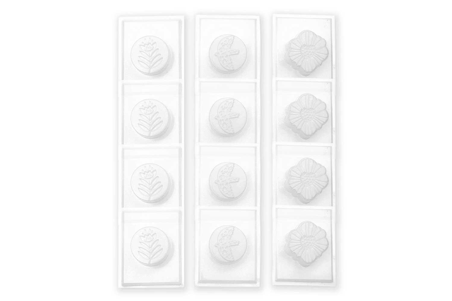 Moules thermoformés transparents, assortis dans 3 modèles : oiseau, fleur et feuille d'arbre. Convient pour la fabrication de savons, ou autres moulages: plâtre, béton, résine...