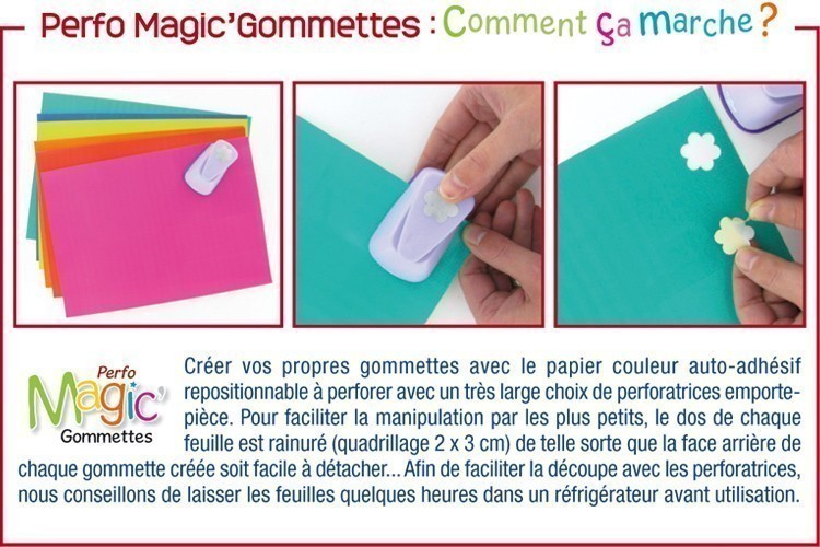 Papier adhésif spécial gommettes. Ces feuilles de papier couleur pour créer des gommettes repositionnables peuvent être découpées avec une simple paire de ciseaux ou être perforées avec des perforatrices fantaisie. De nombreuses clientes nous ont demandé de leur proposer des feuilles de papier à gommettes leur apportant la liberté de créer à leur guise des gommettes de la forme et de la taille qu'elles souhaitent...