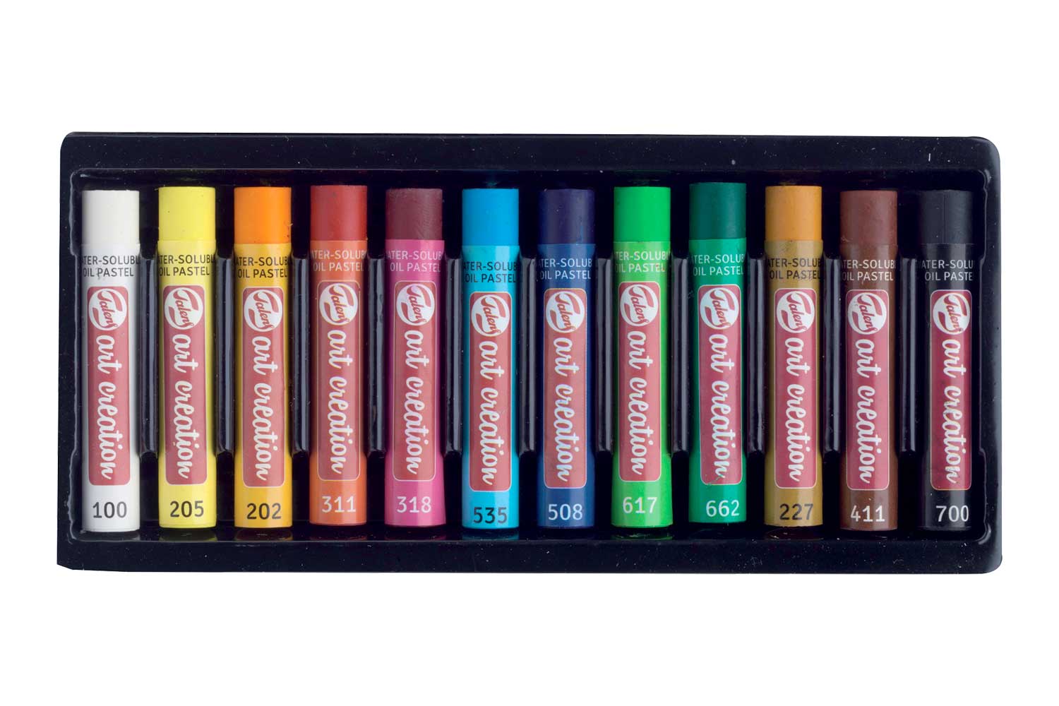 - 12 couleurs : 100 Blanc, 205 Jaune citron (primaire) – 202 Jaune foncé, 311 Vermillon, 318 Carmin, 535 Bleu céruléen, 508 Bleu de Prusse, 617 Vert jaunâtre, 662 Vert permanent, 227 Ocre jaune, 411 Terre de Sienne brûlée, 700 Noir.