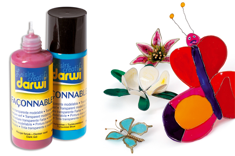 Basée sur la même technique que les peintures repositionnables, mais d’une texture différente, cette peinture, associée à du fil métallique, permet de créer des formes (fleurs, feuilles, pétales...) en plastique souples, résistantes et translucides.