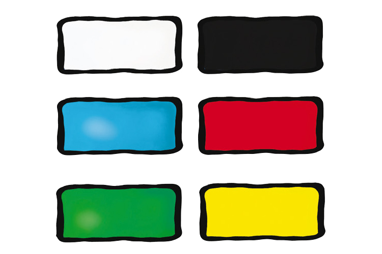 - 6 tubes : blanc, jaune, rouge, bleu clair, vert clair et noir